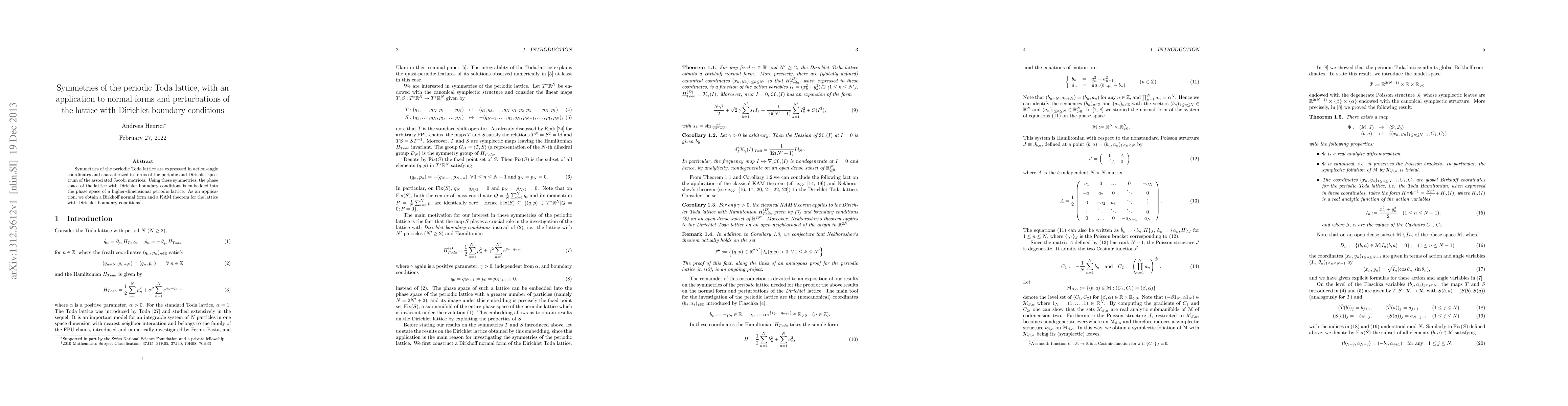 Symmetries of the periodic Toda lattice are expresssed in action-angle coordinates and characterized in terms of the periodic and Dirichlet spectrum of the associated Jacobi matrices. Using these symmetries, the phase space of the lattice with Dirichlet boundary conditions is embedded into the phase space of a higher-dimensional periodic lattice. As an application, we obtain a Birkhoff normal form and a KAM theorem for the lattice with Dirichlet boundary conditions.