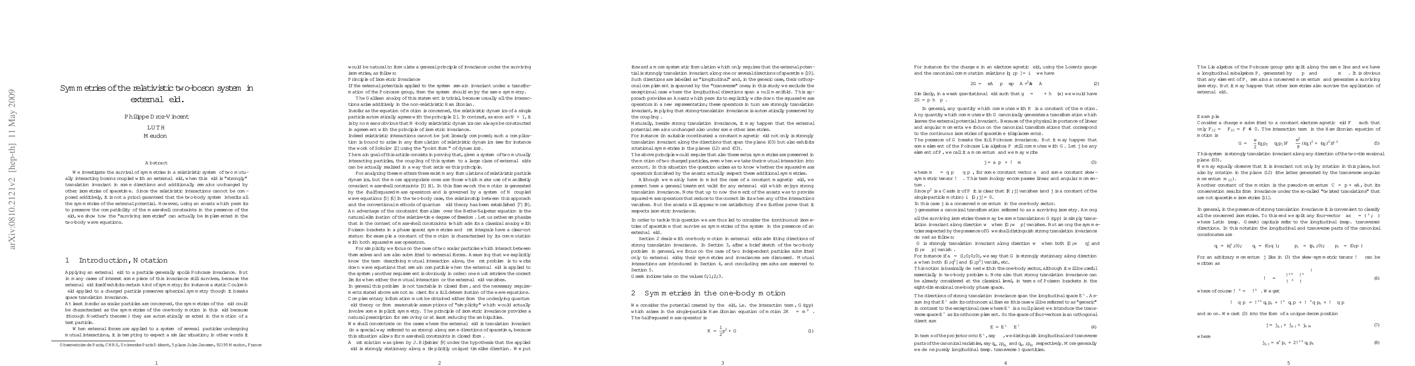This research explores how symmetries in a relativistic system of two interacting bosons remain under a strong external field, which is translationally invariant in certain directions and unchanged by other spacetime isometries. Despite relativistic interaction non-additivity, the study demonstrates that the two-body system can preserve certain 'surviving isometries' through a specific ansatz method, maintaining mass-shell constraints in the presence of the field.