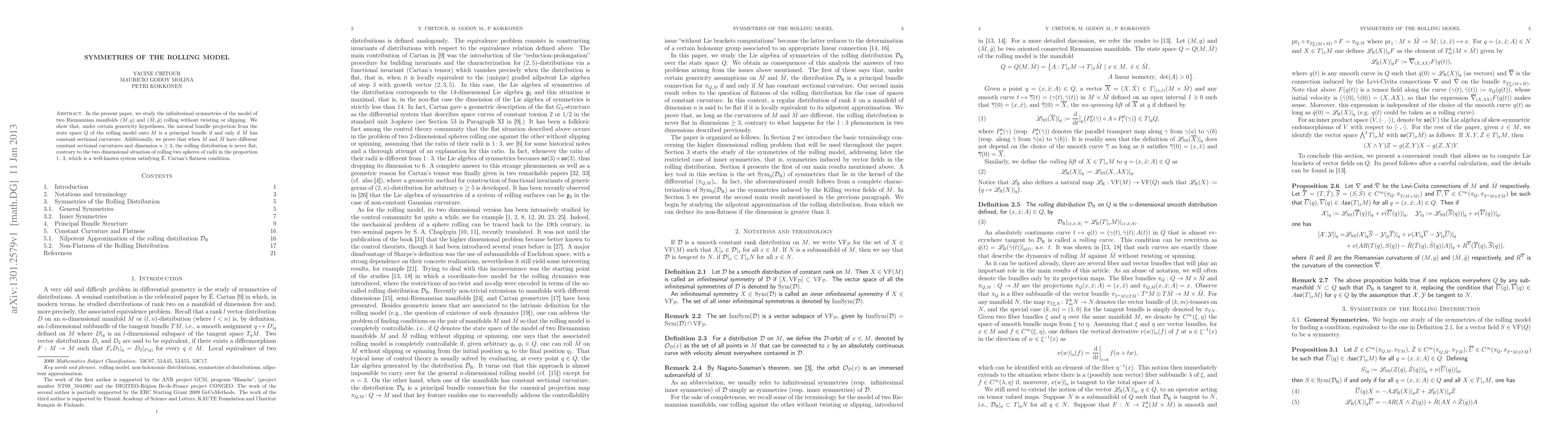 In the present paper, we study the infinitesimal symmetries of the model of two Riemannian manifolds $(M,g)$ and $(\hat M,\hat g)$ rolling without twisting or slipping. We show that, under certain genericity hypotheses, the natural bundle projection from the state space $Q$ of the rolling model onto $M$ is a principal bundle if and only if $\hat M$ has constant sectional curvature. Additionally, we prove that when $M$ and $\hat M$ have different constant sectional curvatures and dimension $n\geq3$, the rolling distribution is never flat, contrary to the two dimensional situation of rolling two spheres of radii in the proportion $1\colon3$, which is a well-known system satisfying \'E. Cartan's flatness condition.