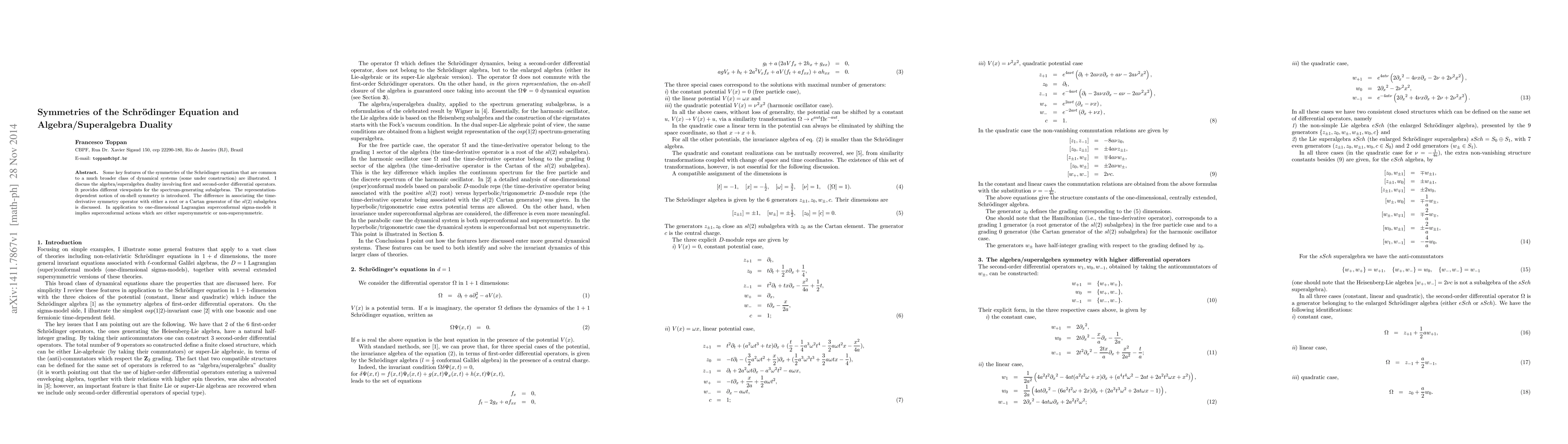 Some key features of the symmetries of the Schr\"odinger equation that are common to a much broader class of dynamical systems (some under construction) are illustrated. I discuss the algebra/superalgebra duality involving first and second-order differential operators. It provides different viewpoints for the spectrum-generating subalgebras. The representation-dependent notion of on-shell symmetry is introduced. The difference in associating the time-derivative symmetry operator with either a root or a Cartan generator of the $sl(2)$ subalgebra is discussed. In application to one-dimensional Lagrangian superconformal sigma-models it implies superconformal actions which are either supersymmetric or non-supersymmetric.