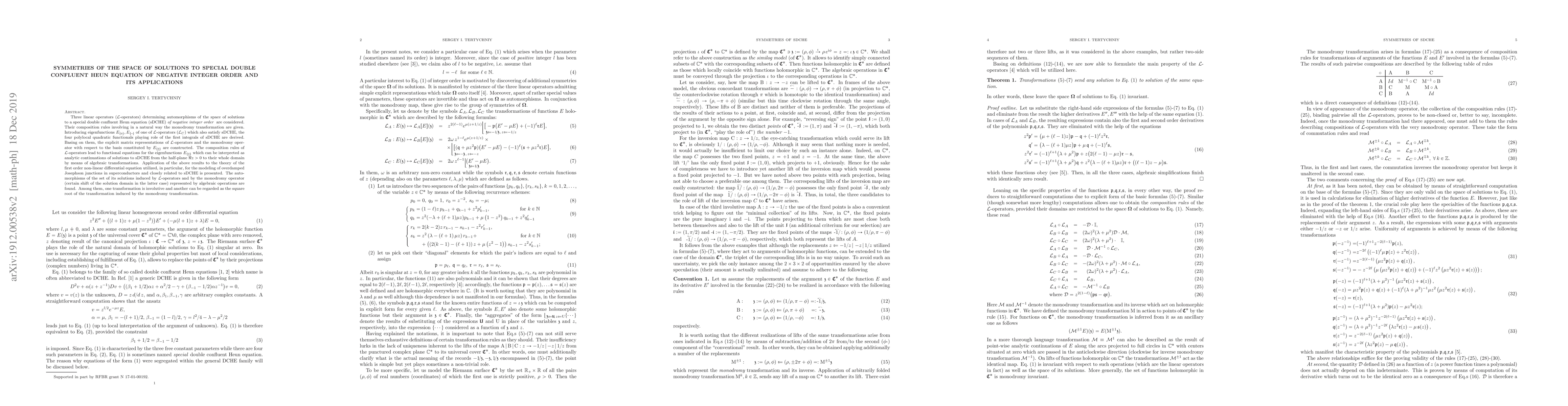 Three linear operators (${\mathcal L}$-operators) determining automorphisms of the space of solutions to a special double confluent Heun equation (sDCHE) of negative integer order are considered. Their composition rules involving in a natural way the monodromy transformation are given. Introducing eigenfunctions $E_{\{+\}}, E_{\{-\}}$ of one of the ${\mathcal L}$-operators (${\mathcal L}_C$) satisfying sDCHE, the four polylocal quadratic functionals playing role of the first integrals of sDCHE are derived. Their use allows to construct the explicit matrix representations of ${\mathcal L}$-operators and the monodromy operator with respect to the basis constituted by $E_{\{\pm\}}$. The composition rules of ${\mathcal L}$-operators lead to functional equations for the eigenfunctions $E_{\{\pm\}}$ which can be interpreted as analytic continuations of solutions to sDCHE from the half-plane $\Re z>0$ to their whole domain by means of algebraic transformations. Application of the above results to the theory of the first order non-linear differential equation utilized, in particular, for the modeling of overdamped Josephson junctions in superconductors and closely related to sDCHE is presented. The automorphisms of the set of its solutions induced by ${\mathcal L}$-operators and by the monodromy operator (certain shift of the solution domain in the latter case) are found which are realized by certain algebraic operations. Among them, one transformation is involutive and another one can be regarded as the square root of the transformation induced by the monodromy transformation.
