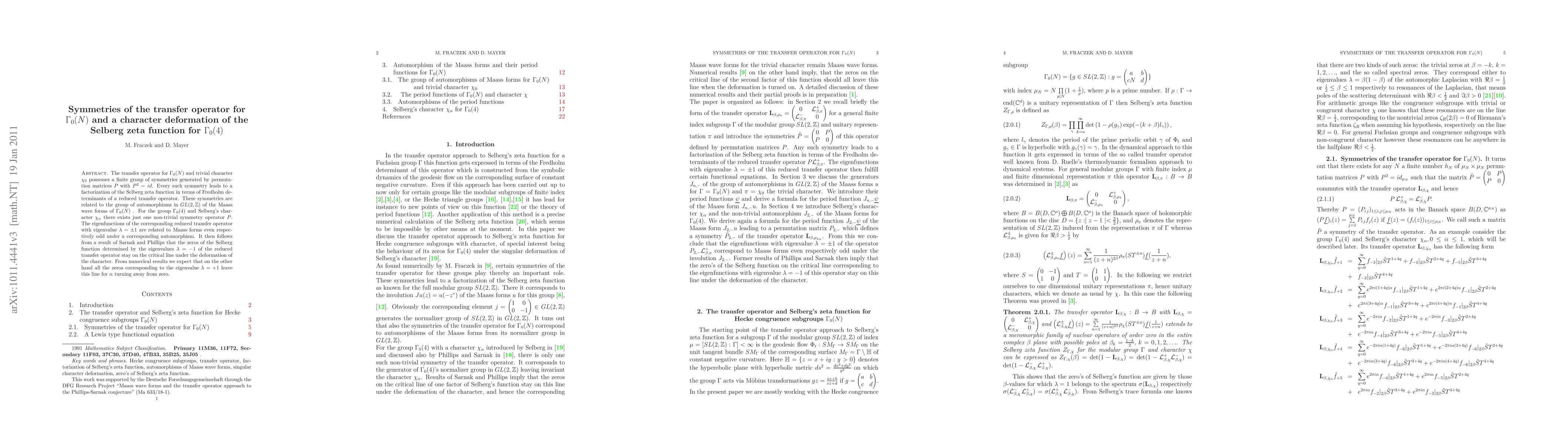 The transfer operator for $\Gamma_0(N)$ and trivial character $\chi_0$ possesses a finite group of symmetries generated by permutation matrices $P$ with $P^2=id$. Every such symmetry leads to a factorization of the Selberg zeta function in terms of Fredholm determinants of a reduced transfer operator. These symmetries are related to the group of automorphisms in $GL(2,\mathbb{Z})$ of the Maass wave forms of $\Gamma_0(N)$ . For the group $\Gamma_0(4)$ and Selberg's character $\chi_\alpha$ there exists just one non-trivial symmetry operator $P$. The eigenfunctions of the corresponding reduced transfer operator with eigenvalue $\lambda=\pm 1$ are related to Maass forms even respectively odd under a corresponding automorphism. It then follows from a result of Sarnak and Phillips that the zeros of the Selberg function determined by the eigenvalues $\lambda=-1$ of the reduced transfer operator stay on the critical line under the deformation of the character. From numerical results we expect that on the other hand all the zeros corresponding to the eigenvalue $\lambda=+1$ leave this line for $\alpha$ turning away from zero.