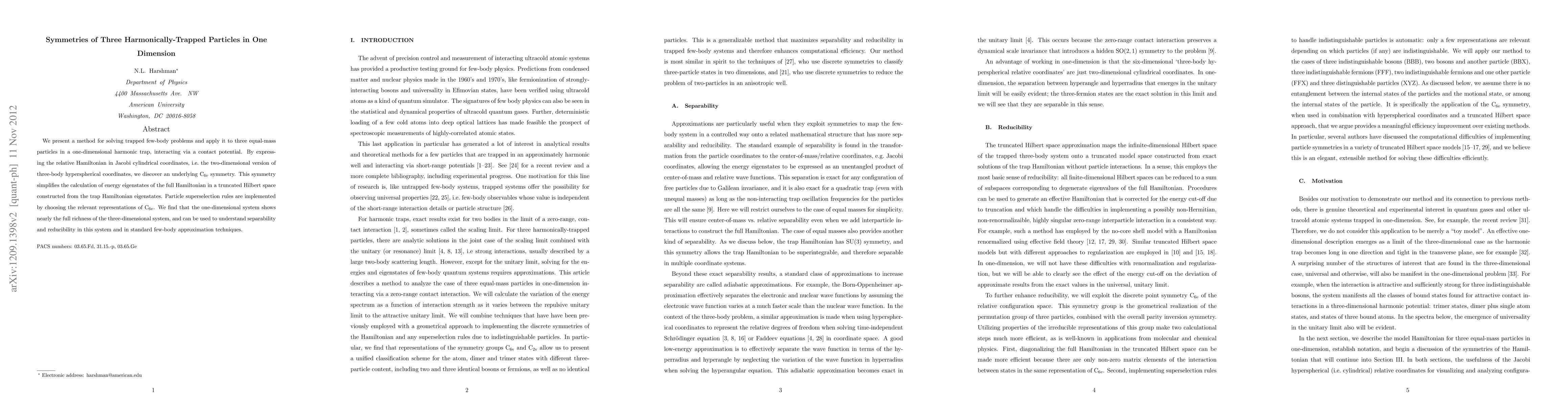 This paper solves the few-body problem of three equal-mass particles in a one-dimensional harmonic trap using a method that reveals a ${\rm C}_{6v}$ symmetry, simplifying the calculation of energy eigenstates. The study demonstrates the system's complexity and its utility in understanding separability and reducibility in few-body problems.