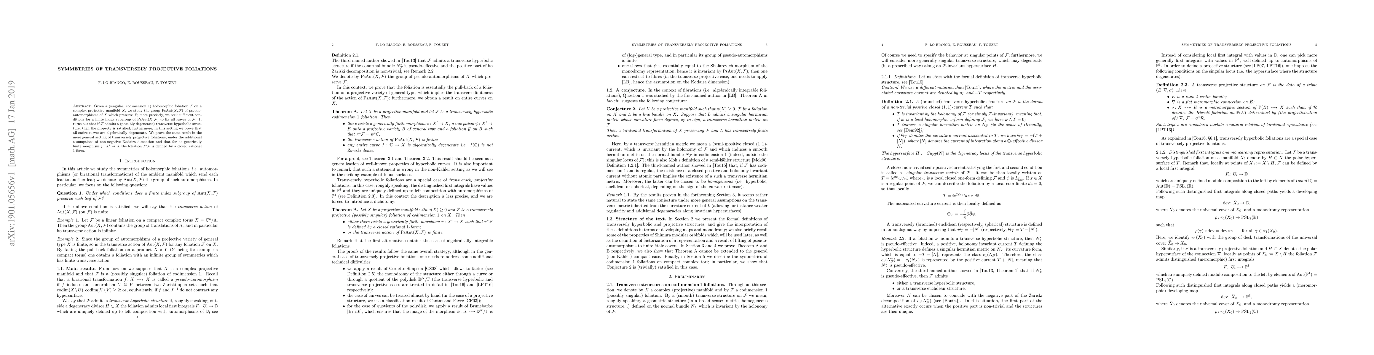 This paper investigates the symmetries of holomorphic foliations on complex projective manifolds, focusing on pseudo-automorphisms preserving the foliation. It finds that foliations with transverse hyperbolic structures have fixed leaves under certain subgroups, and proves that all entire curves are algebraically degenerate in these settings.