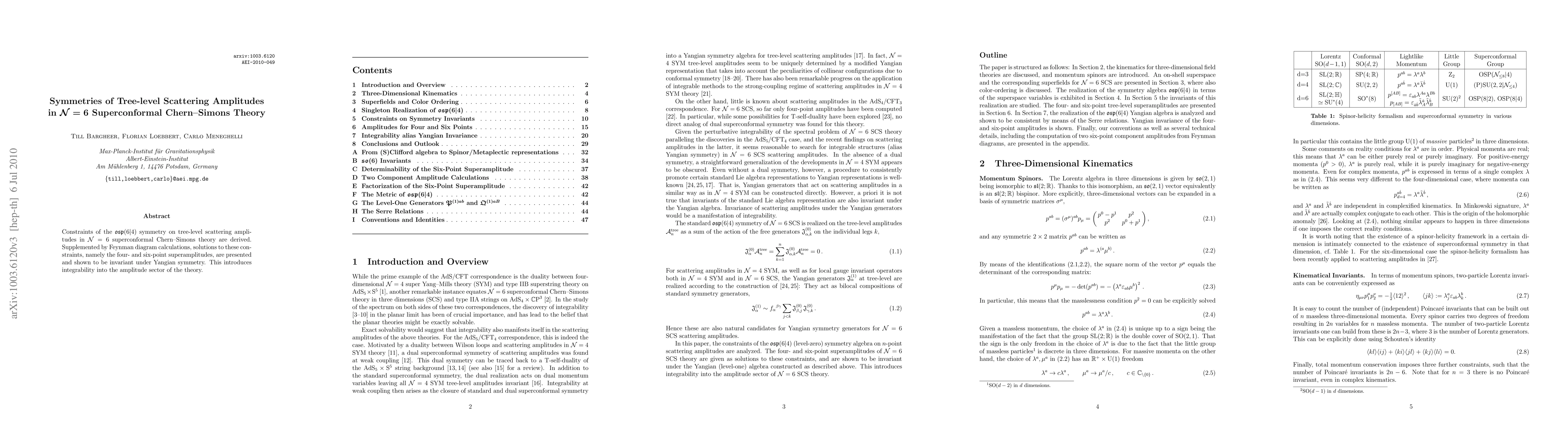 This research derives constraints from osp(6|4) symmetry on tree-level scattering amplitudes in N=6 superconformal Chern-Simons theory and presents the four- and six-point superamplitudes that satisfy these constraints and exhibit Yangian symmetry, thus introducing integrability into the theory's amplitude sector.