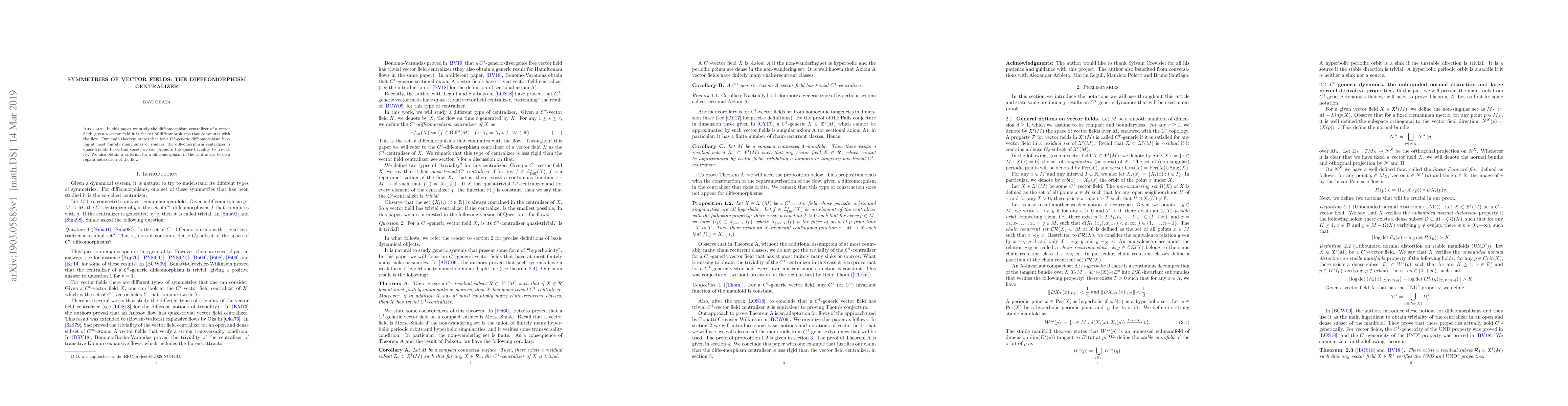 The paper studies the diffeomorphism centralizer of a vector field, focusing on $C^1$-generic diffeomorphisms with at most finitely many sinks or sources.