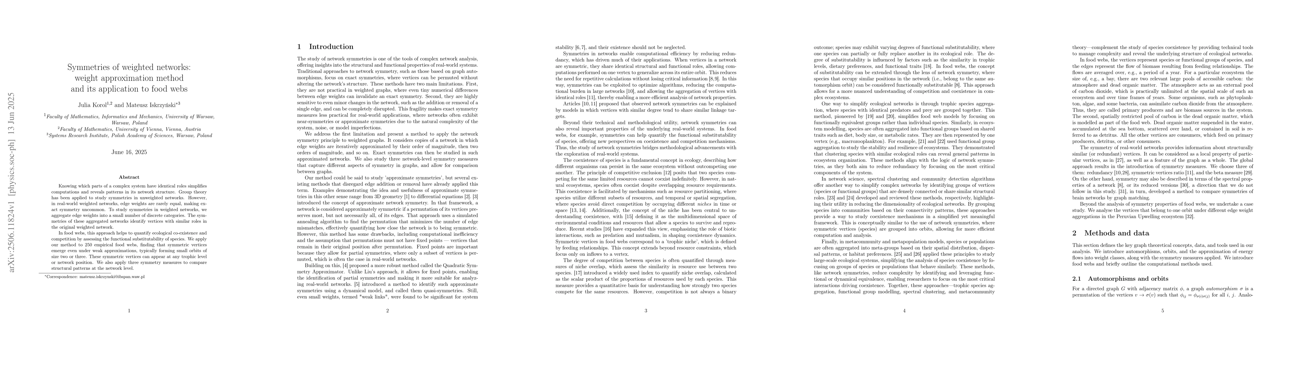 Knowing which parts of a complex system have identical roles simplifies computations and reveals patterns in its network structure. Group theory has been applied to study symmetries in unweighted networks. However, in real-world weighted networks, edge weights are rarely equal, making exact symmetry uncommon. To study symmetries in weighted networks, we aggregate edge weights into a small number of discrete categories. The symmetries of these aggregated networks identify vertices with similar roles in the original weighted network. In food webs, this approach helps to quantify ecological co-existence and competition by assessing the functional substitutability of species. We apply our method to 250 empirical food webs, finding that symmetric vertices emerge even under weak approximations, typically forming small orbits of size two or three. These symmetric vertices can appear at any trophic level or network position. We also apply three symmetry measures to compare structural patterns at the network level.