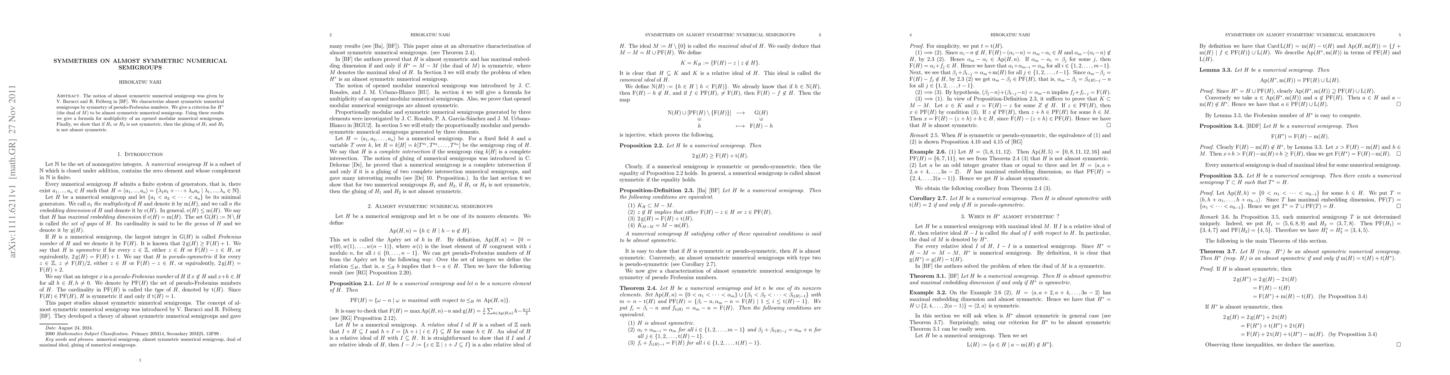 The notion of almost symmetric numerical semigroup was given by V. Barucci and R. Fr\"oberg. We characterize almost symmetric numerical semigroups by symmetry of pseudo-Frobenius numbers. We give a criterion for $H^*$ (the dual of $M$) to be almost symmetric numerical semigroup. Using these results we give a formula for multiplicity of an opened modular numerical semigroups. Finally, we show that if $H_1$ or $H_2$ is not symmetric, then the gluing of $H_1$ and $H_2$ is not almost symmetric.