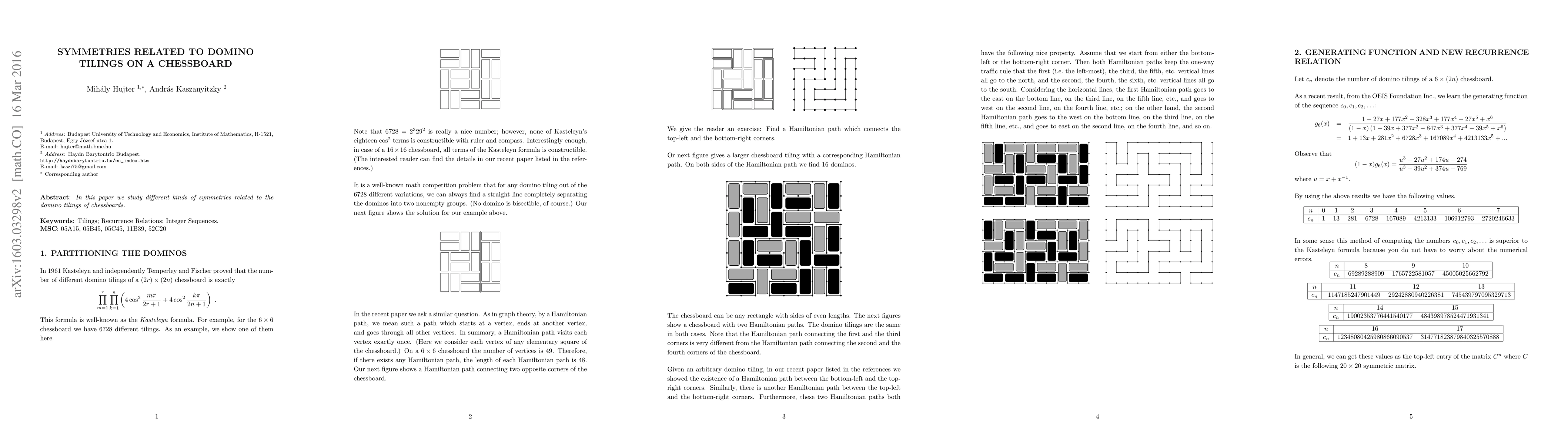 In this paper we study different kinds of symmetries related to the domino tilings of chessboards.