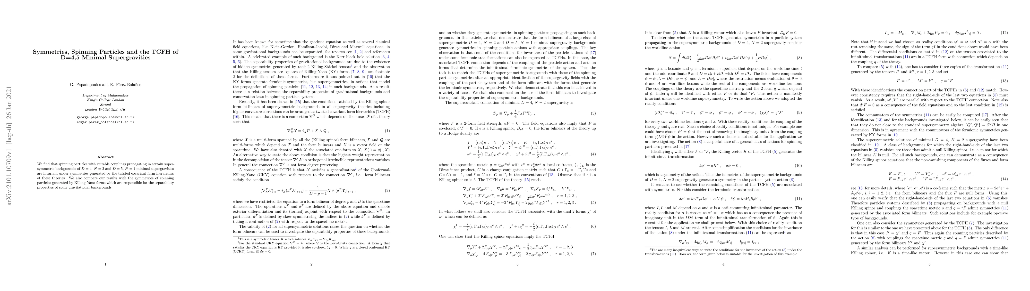 This paper investigates the symmetries of spinning particles in $D=4$, $N=2$ and $D=5$, $N=1$ minimal supergravities, showing invariance under the twisted covariant form hierarchies. It also compares these symmetries with those derived from Killing-Yano forms related to separability in gravitational backgrounds.