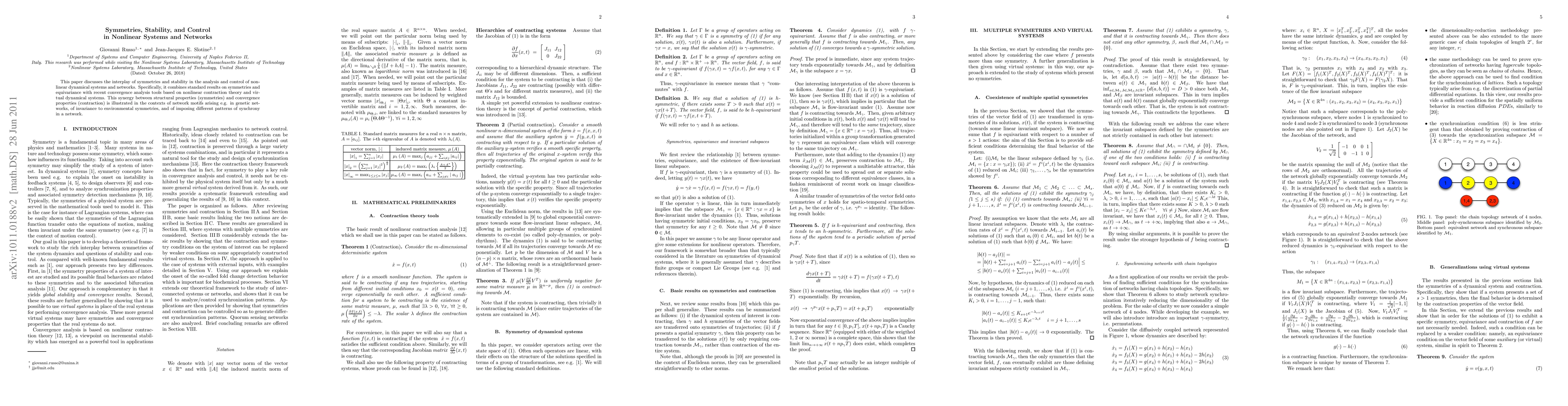 This paper discusses the interplay of symmetries and stability in the analysis and control of nonlinear dynamical systems and networks. Specifically, it combines standard results on symmetries and equivariance with recent convergence analysis tools based on nonlinear contraction theory and virtual dynamical systems. This synergy between structural properties (symmetries) and convergence properties (contraction) is illustrated in the contexts of network motifs arising e.g. in genetic networks, of invariance to environmental symmetries, and of imposing different patterns of synchrony in a network.