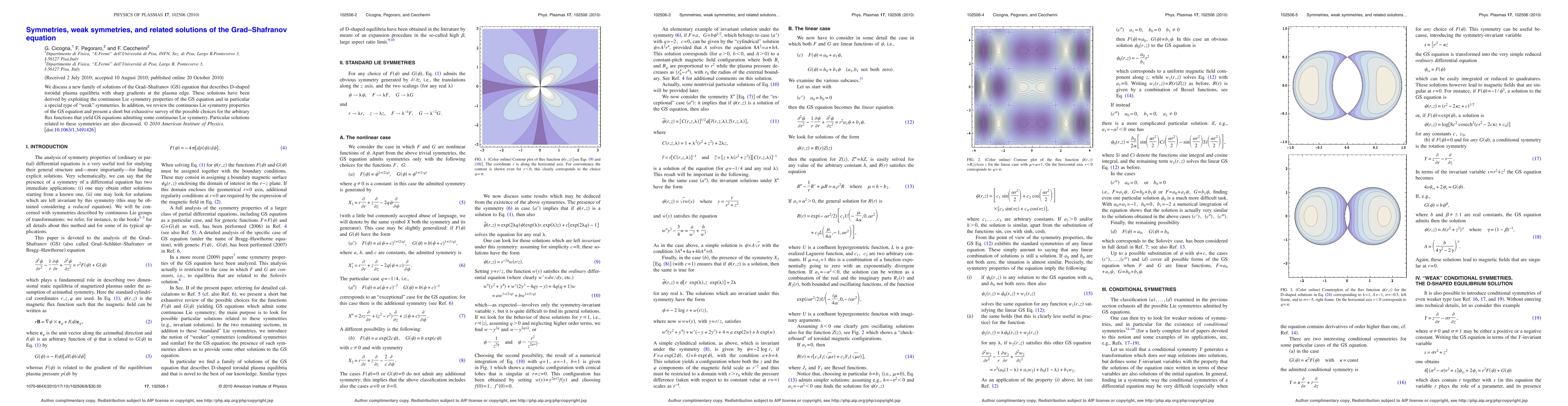 This paper presents new solutions to the Grad-Shafranov equation describing D-shaped toroidal plasma equilibria, derived through the use of continuous Lie symmetry properties, particularly "weak" symmetries. It also reviews the equation's symmetry properties and explores various flux functions that allow for these symmetries.