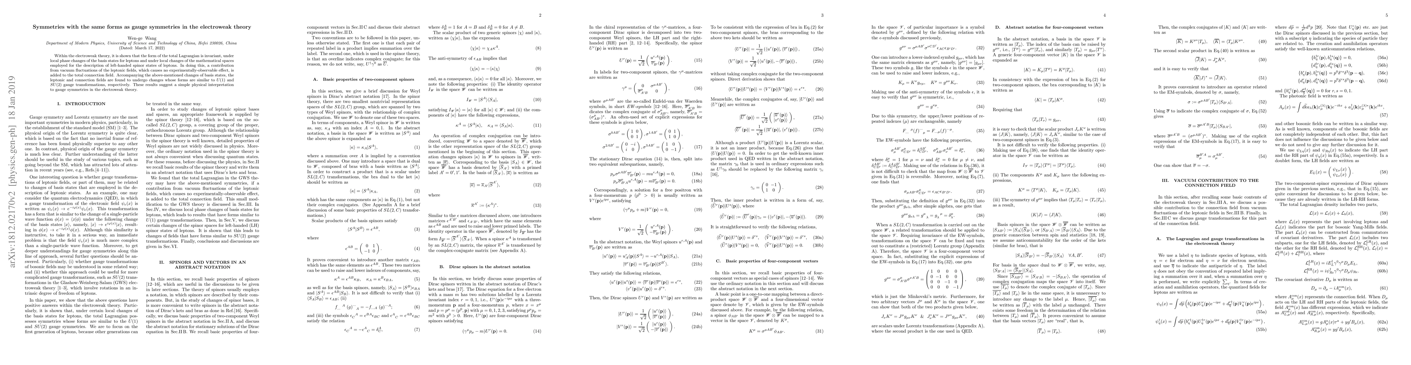 Within the electroweak theory, it is shown that the form of the total Lagrangian is invariant, under local phase changes of the basis states for leptons and under local changes of the mathematical spaces employed for the description of left-handed spinor states of leptons. In doing this, a contribution from vacuum fluctuations of the leptonic fields, which causes no experimentally-observable effect, is added to the total connection field. Accompanying the above-mentioned changes of basis states, the leptonic and connection fields are found to undergo changes whose forms are similar to $U(1)$ and $SU(2)$ gauge transformations, respectively. These results suggest a simple physical interpretation to gauge symmetries in the electroweak theory.