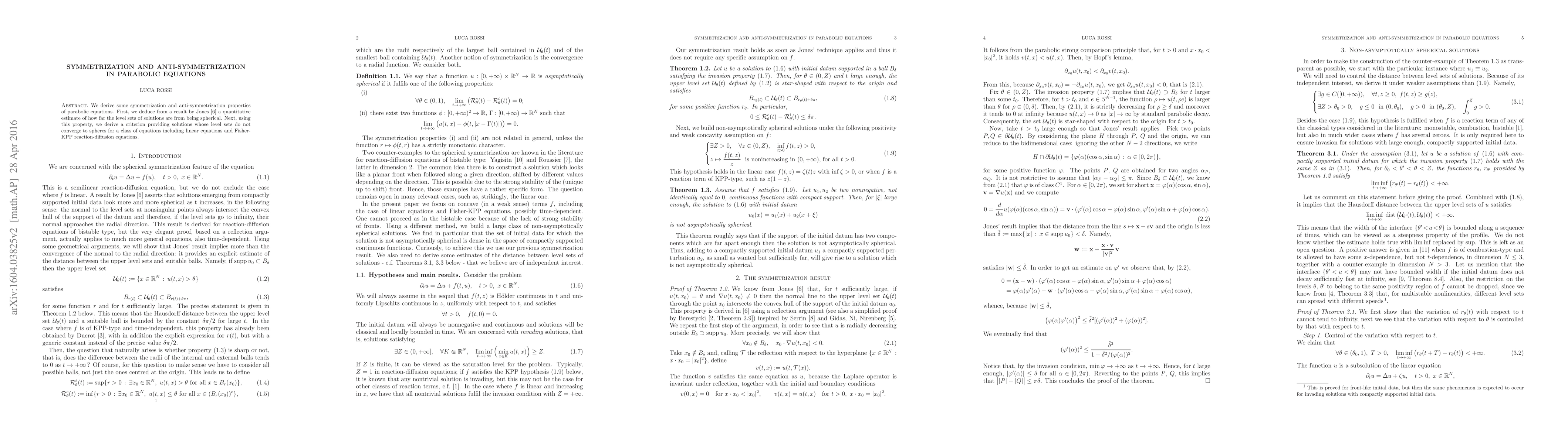 This paper derives symmetrization and anti-symmetrization properties for parabolic equations, utilizing Jones's quantitative estimate to show how far solution level sets deviate from sphericity. It then establishes a criterion for solutions whose level sets do not converge to spheres, applicable to linear equations and Fisher-KPP reaction-diffusion equations.