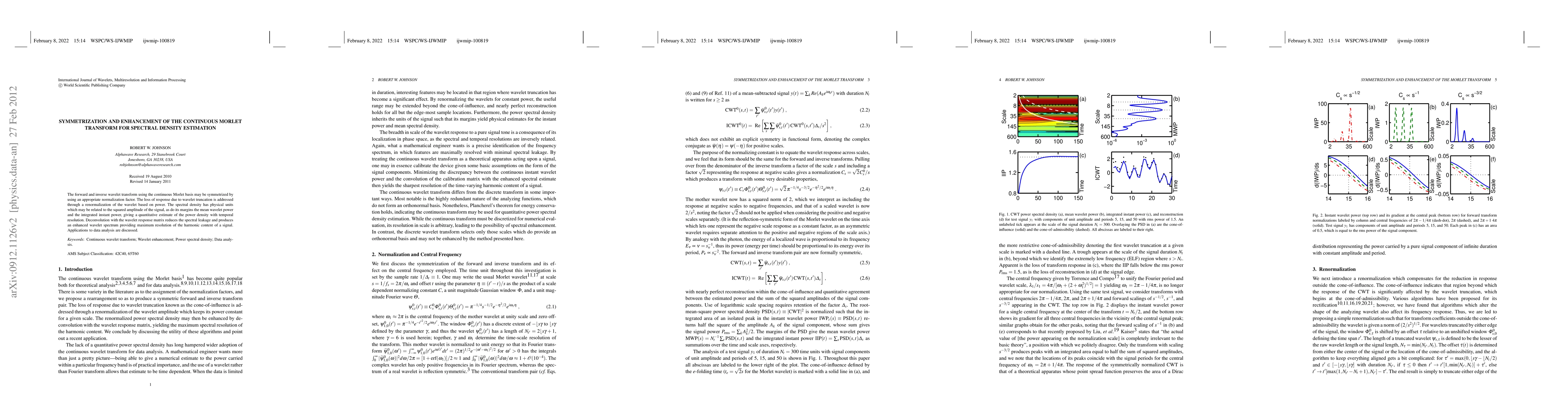 The forward and inverse wavelet transform using the continuous Morlet basis may be symmetrized by using an appropriate normalization factor. The loss of response due to wavelet truncation is addressed through a renormalization of the wavelet based on power. The spectral density has physical units which may be related to the squared amplitude of the signal, as do its margins the mean wavelet power and the integrated instant power, giving a quantitative estimate of the power density with temporal resolution. Deconvolution with the wavelet response matrix reduces the spectral leakage and produces an enhanced wavelet spectrum providing maximum resolution of the harmonic content of a signal. Applications to data analysis are discussed.