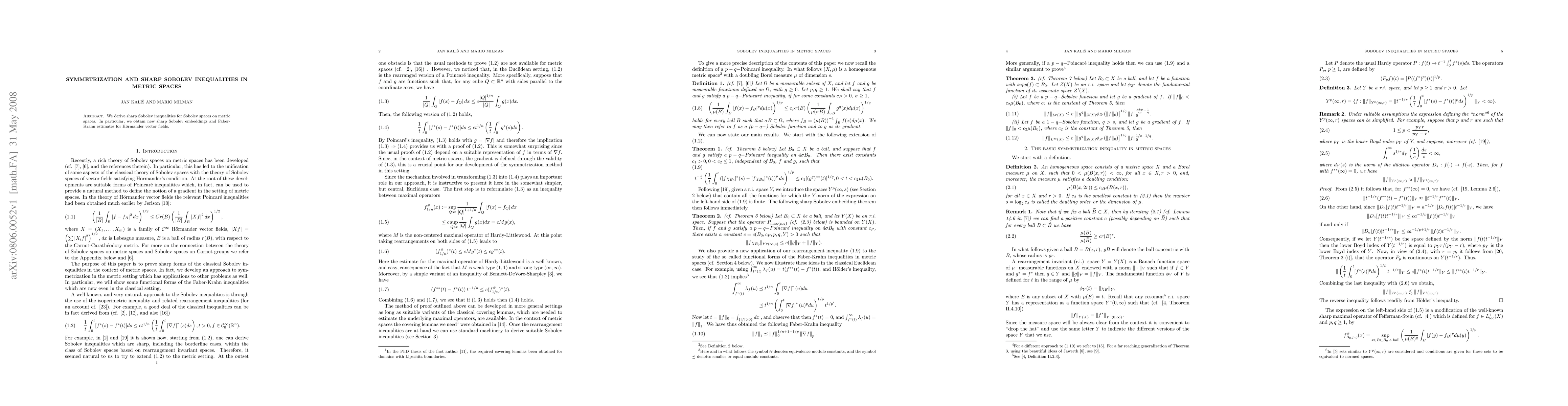 This paper establishes sharp Sobolev inequalities and embeddings for Sobolev spaces on metric spaces, focusing on H\"{o}rmander vector fields, and introduces new sharp Faber-Krahn estimates. The methodology involves symmetrization techniques to achieve optimal results.