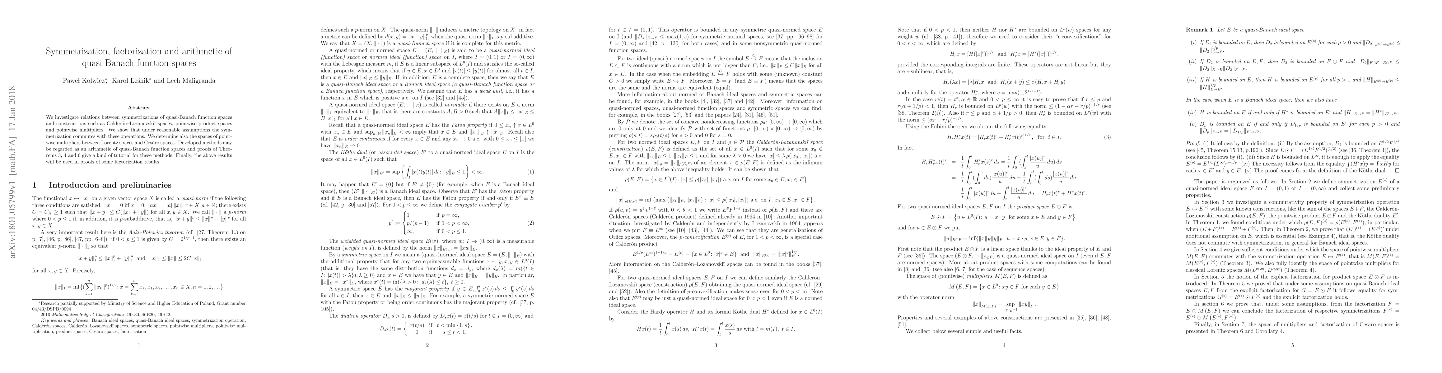 This research explores relationships between symmetrizations of quasi-Banach function spaces and specific constructions like Calderon-Lozanovskii and pointwise product spaces. It demonstrates that symmetrization commutes with these operations under certain conditions. The study also identifies spaces of pointwise multipliers between Lorentz and Cesaro spaces, introducing a form of 'arithmetic' for quasi-Banach function spaces. These methods support proofs of factorization results.