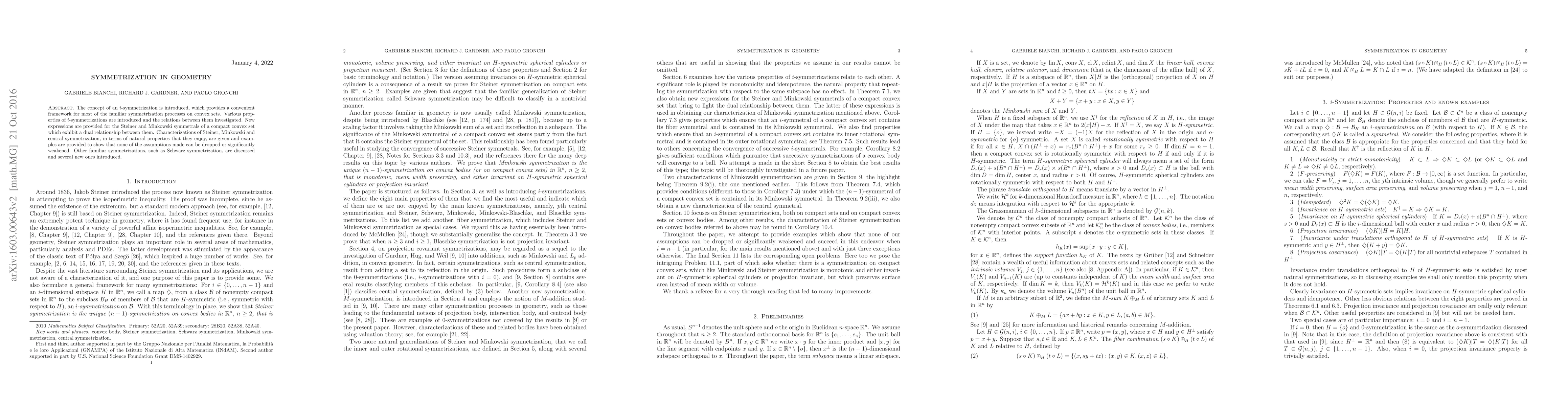 This paper introduces $i$-symmetrization, a framework for familiar symmetrization processes on convex sets, and explores its properties, dual relationships with Steiner and Minkowski symmetrals, and characterizations of various symmetrizations. It also presents new expressions and examples to illustrate the limitations of the assumptions made.