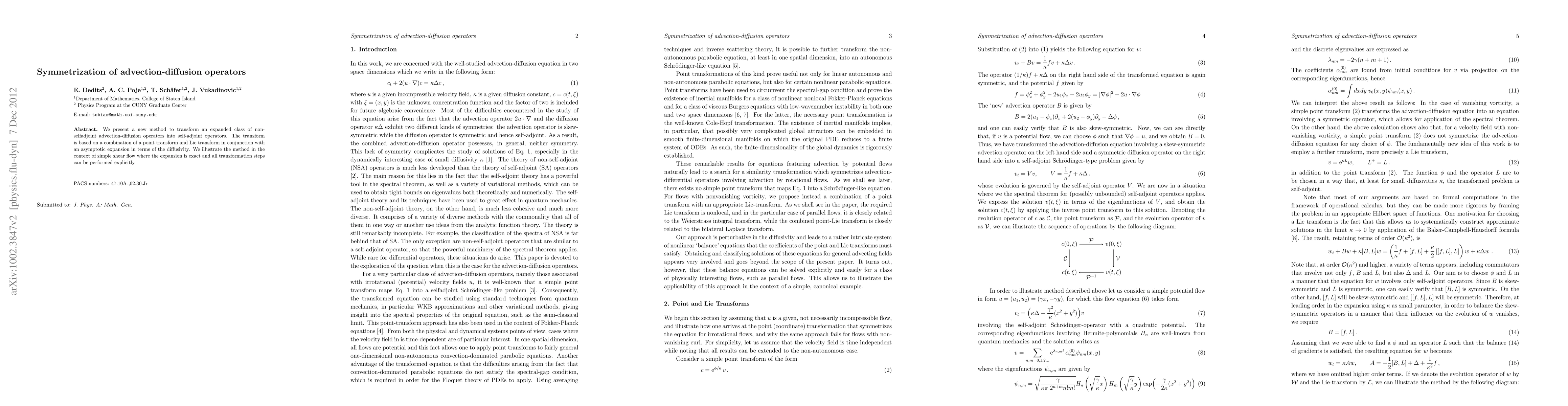 We present a new method to transform an expanded class of non-selfadjoint advection-diffusion operators into self-adjoint operators. The transform is based on a combination of a point transform and Lie transform in conjunction with an asymptotic expansion in terms of the diffusivity. We illustrate the method in the context of simple shear flow where the expansion is exact and all transformation steps can be performed explicitly.