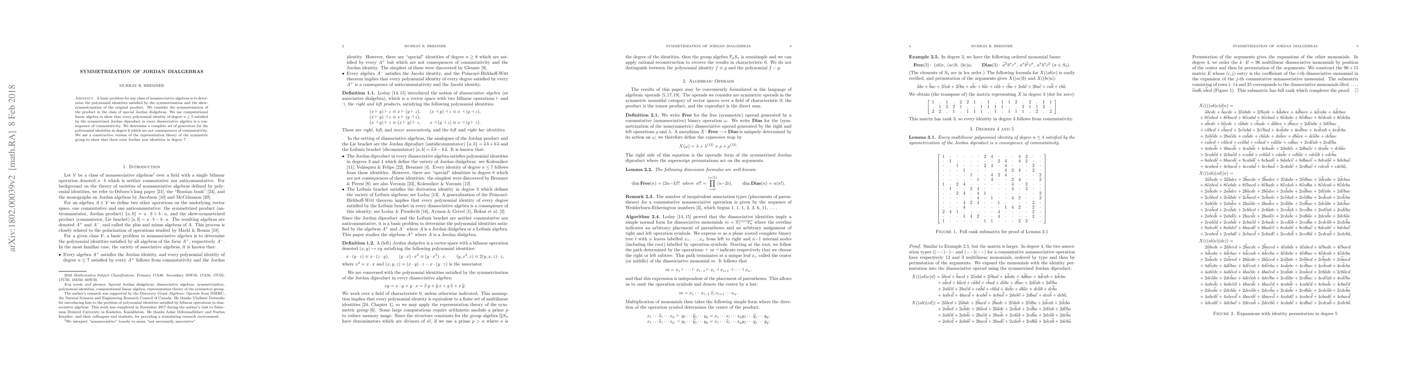 A basic problem for any class of nonassociative algebras is to determine the polynomial identities satisfied by the symmetrization and the skew-symmetrization of the original product. We consider the symmetrization of the product in the class of special Jordan dialgebras. We use computational linear algebra to show that every polynomial identity of degree $n \le 5$ satisfied by the symmetrized Jordan diproduct in every diassociative algebra is a consequence of commutativity. We determine a complete set of generators for the polynomial identities in degree 6 which are not consequences of commutativity. We use a constructive version of the representation theory of the symmetric group to show that there exist further new identities in degree 7.
