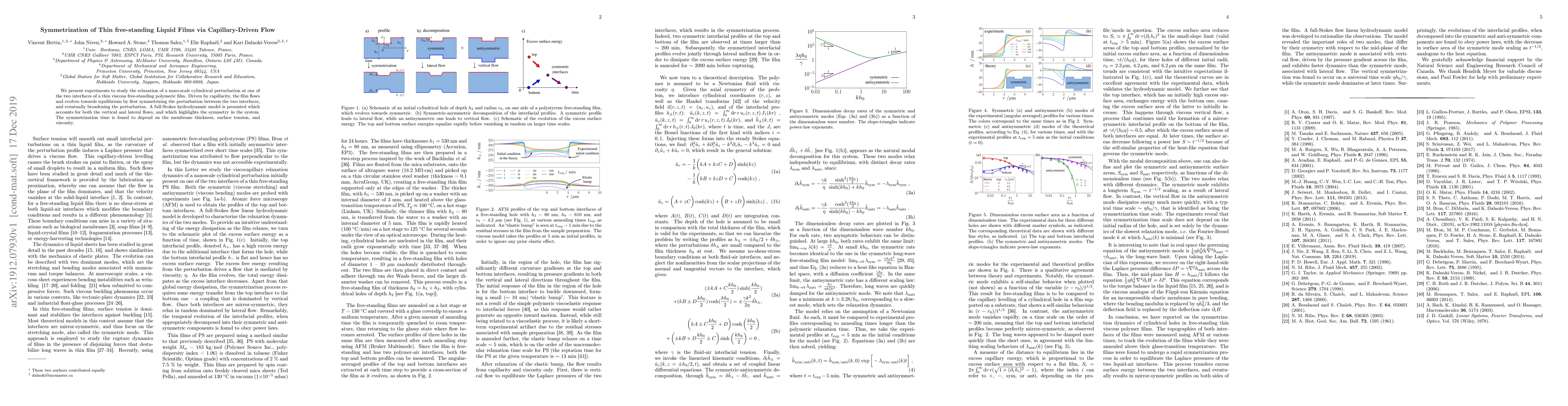 We present experiments to study the relaxation of a nano-scale cylindrical perturbation at one of the two interfaces of a thin viscous free-standing polymeric film. Driven by capillarity, the film flows and evolves towards equilibrium by first symmetrizing the perturbation between the two interfaces, and eventually broadening the perturbation. A full-Stokes hydrodynamic model is presented which accounts for both the vertical and lateral flows, and which highlights the symmetry in the system. The symmetrization time is found to depend on the membrane thickness, surface tension, and viscosity.