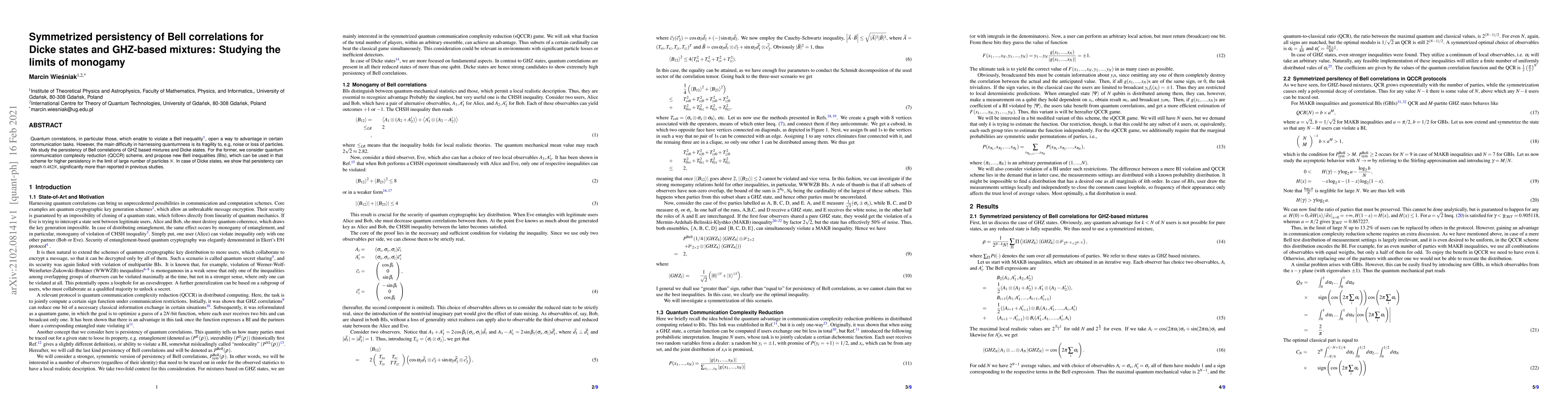 Quantum correlations, in particular those, which enable to violate a Bell inequality \cite{BELL}, open a way to advantage in certain communication tasks. However, the main difficulty in harnessing quantumness is its fragility to, e.g, noise or loss of particles. We study the persistency of Bell correlations of GHZ based mixtures and Dicke states. For the former, we consider quantum communication complexity reduction (QCCR) scheme, and propose new Bell inequalities (BIs), which can be used in that scheme for higher persistency in the limit of large number of particles $N$. In case of Dicke states, we show that persistency can reach $0.482N$, significantly more than reported in previous studies.