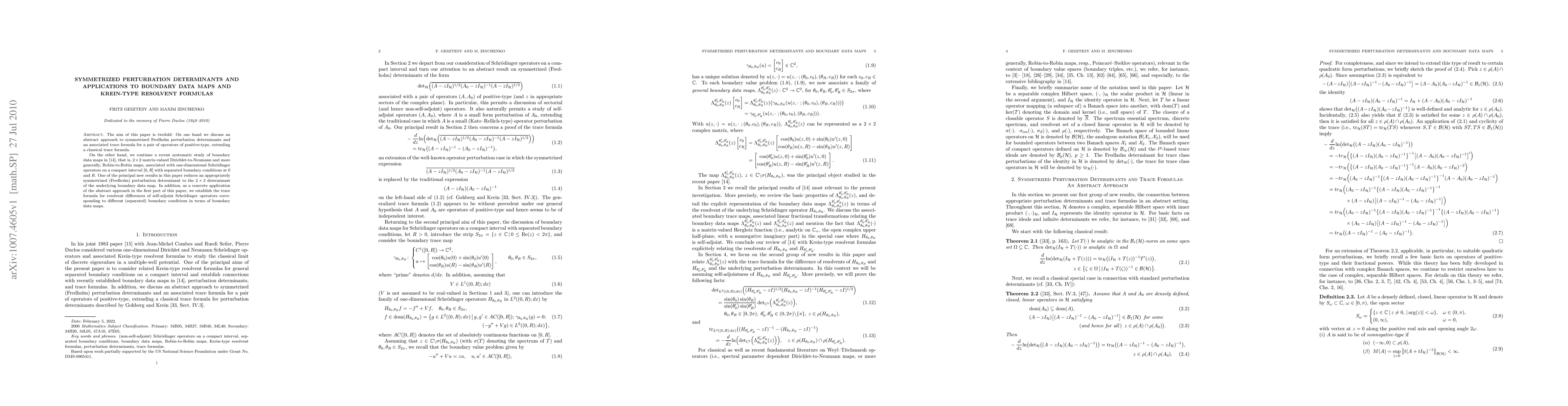 This paper develops an abstract framework for symmetrized Fredholm perturbation determinants and extends classical trace formulas. It also advances the study of boundary data maps for 1D Schrödinger operators, showing how symmetrized perturbation determinants relate to the determinants of these maps, and applies this to derive a trace formula for resolvent differences under different boundary conditions.