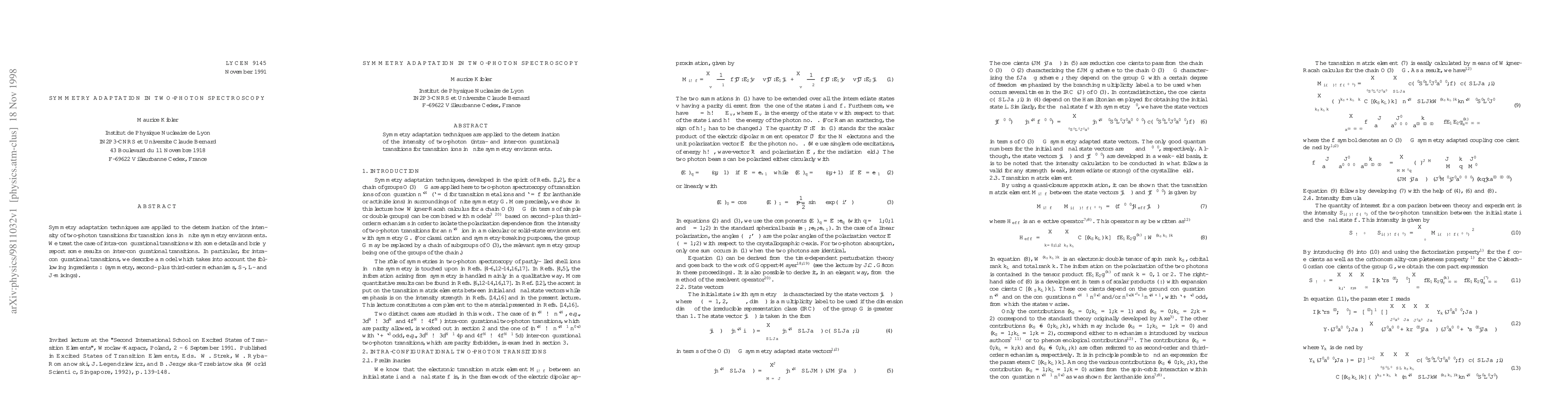 Researchers applied symmetry adaptation techniques to two-photon spectroscopy, developing a model that considers symmetry, order mechanisms, and mixing effects in transition ions. This work aims to improve the understanding of intensity in finite symmetry environments for both intra- and inter-configurational transitions.