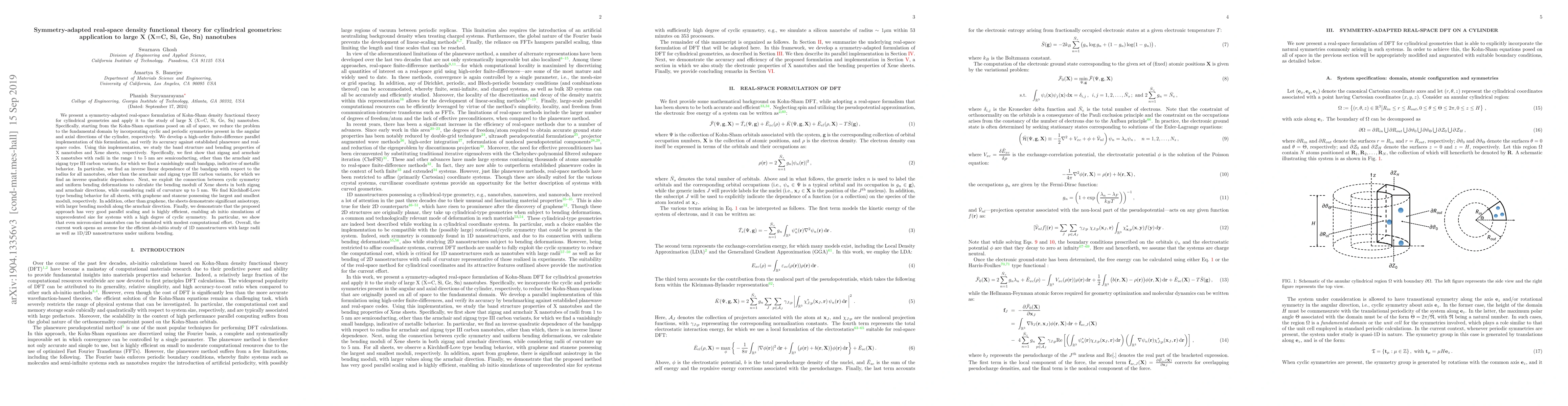 This paper introduces a symmetry-adapted real-space density functional theory for cylindrical geometries, applied to large carbon, silicon, germanium, and tin nanotubes. The method reveals semiconducting properties of zigzag and armchair nanotubes, with an inverse linear bandgap dependence on radius, and calculates bending moduli for Xene sheets, showing significant anisotropy and efficient parallel scaling.