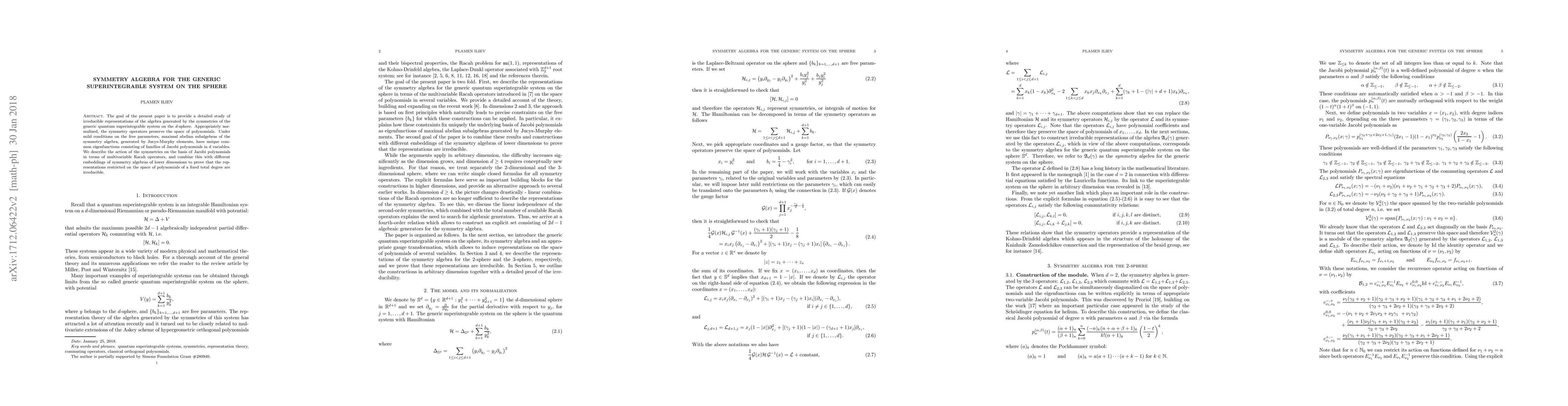 This paper explores the symmetry algebra of the generic quantum superintegrable system on the $d$-sphere, demonstrating that its maximal abelian subalgebras have unique common eigenfunctions based on families of Jacobi polynomials. It shows that these representations, when restricted to polynomials of a fixed total degree, are irreducible.