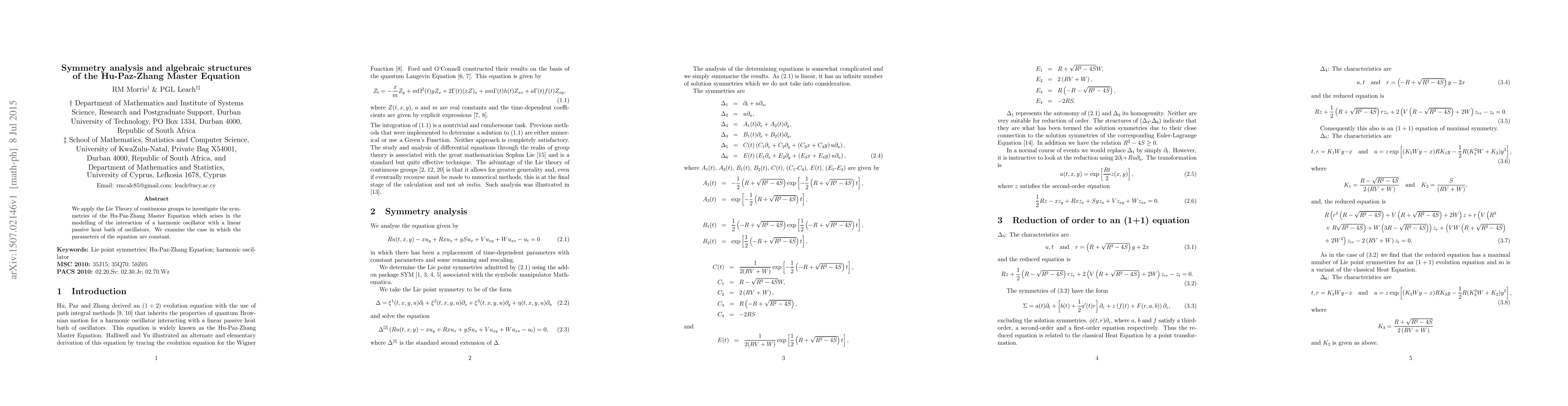 This paper uses Lie Theory to analyze the symmetries of the Hu-Paz-Zhang Master Equation, which models the interaction between a harmonic oscillator and a linear passive heat bath. The study focuses on the case where the equation's parameters remain constant.