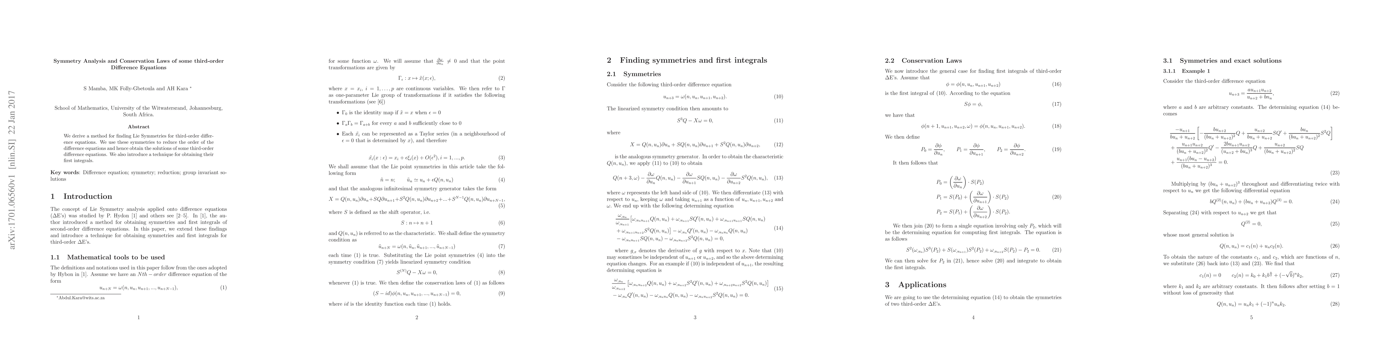 This paper develops a method for identifying Lie Symmetries in third-order difference equations, utilizing these symmetries to reduce the equations' order and derive their solutions, along with a technique for finding their first integrals.