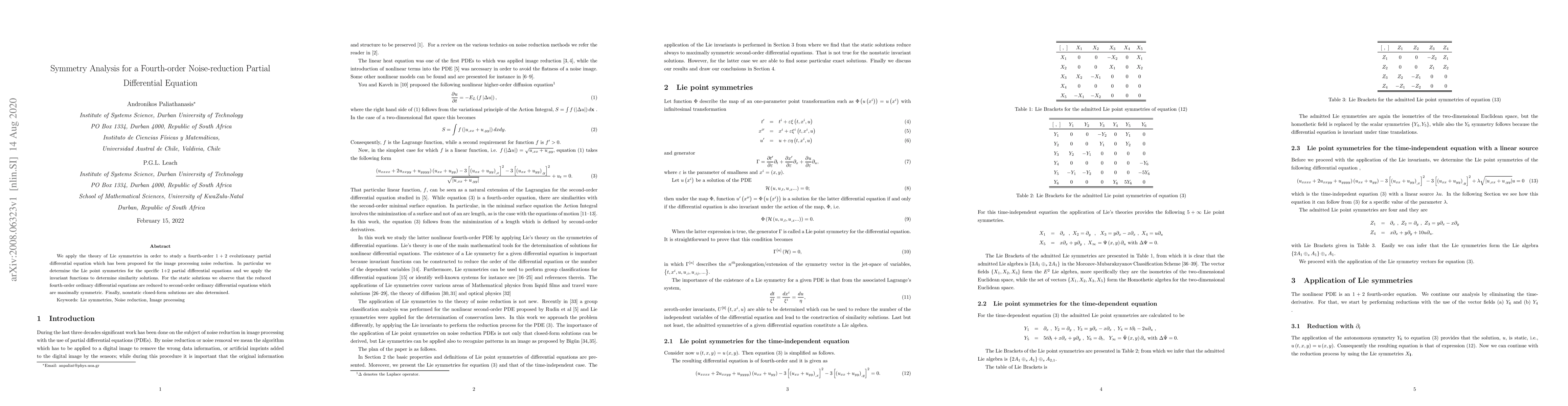 This paper utilizes Lie symmetry theory to analyze a fourth-order partial differential equation for noise reduction in image processing. It determines Lie point symmetries and invariant functions to derive similarity solutions, reducing static solutions to maximally symmetric second-order ODEs and finding closed-form nonstatic solutions.