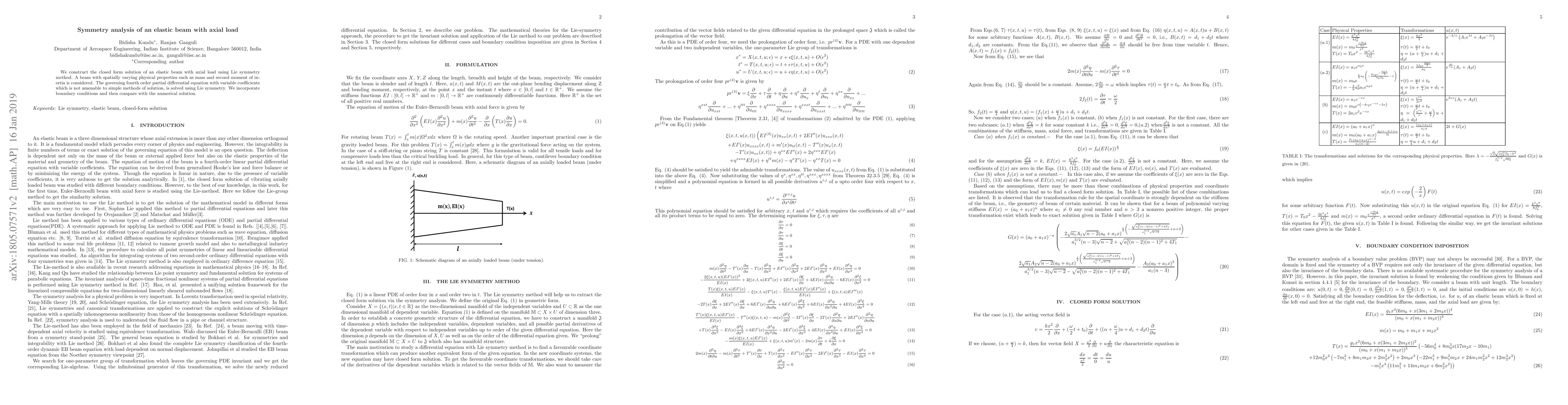 We construct the closed form solution of an elastic beam with axial load using Lie symmetry method. A beam with spatially varying physical properties such as mass and second moment of inertia is considered. The governing fourth order partial differential equation with variable coefficients which is not amenable to simple methods of solution, is solved using Lie symmetry. We incorporate boundary conditions and then compare with the numerical solution.