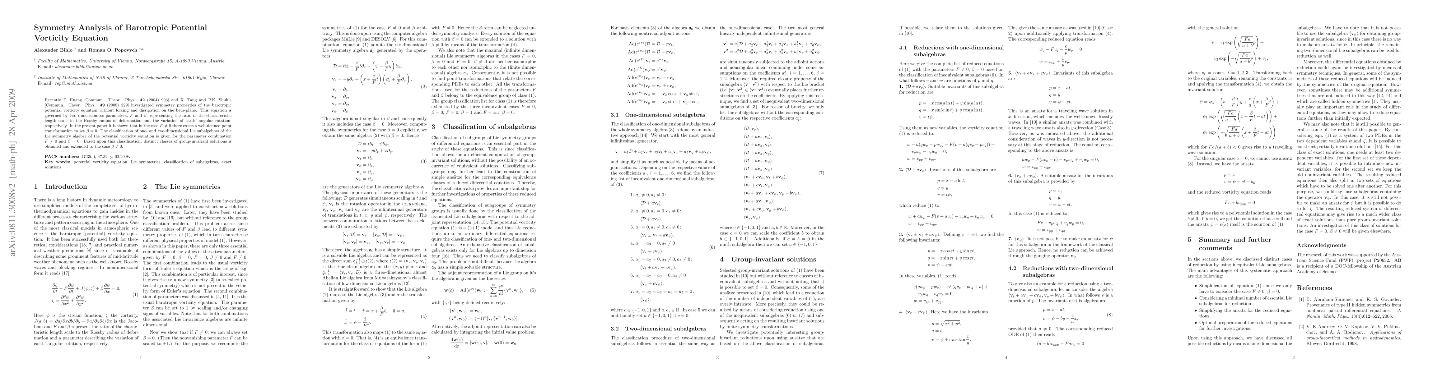 This paper investigates the symmetry properties of the barotropic potential vorticity equation on the beta-plane, demonstrating that a point transformation can set $\beta = 0$ when $F \ne 0$. It classifies the Lie subalgebras and derives group-invariant solutions, extending these findings to cases where $\beta \ne 0$.