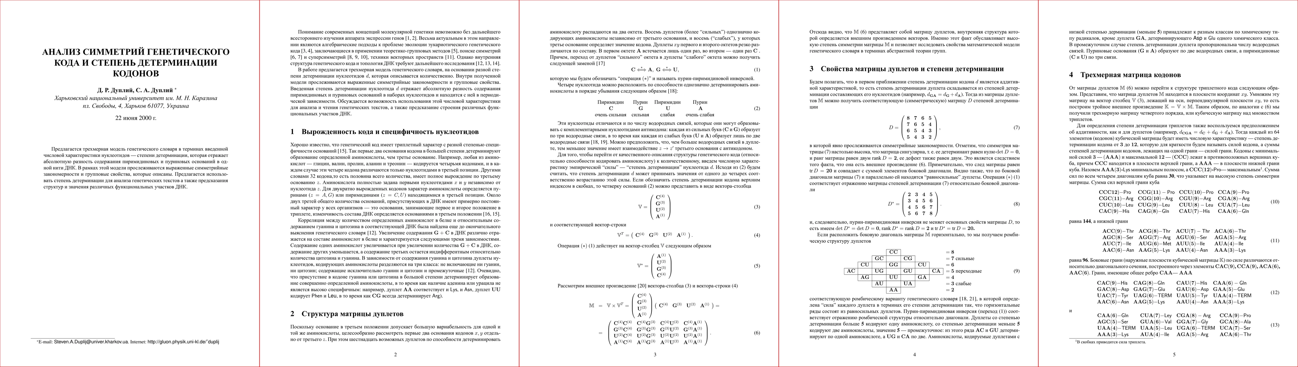 A 3D model of genetic vocabulary is proposed based on determinative degree, which reflects difference between purin and pyrimidin bases in one DNA strand. The study aims to analyze genetic texts using codon determinative degree and explain biological sense of various functional regions of DNA.