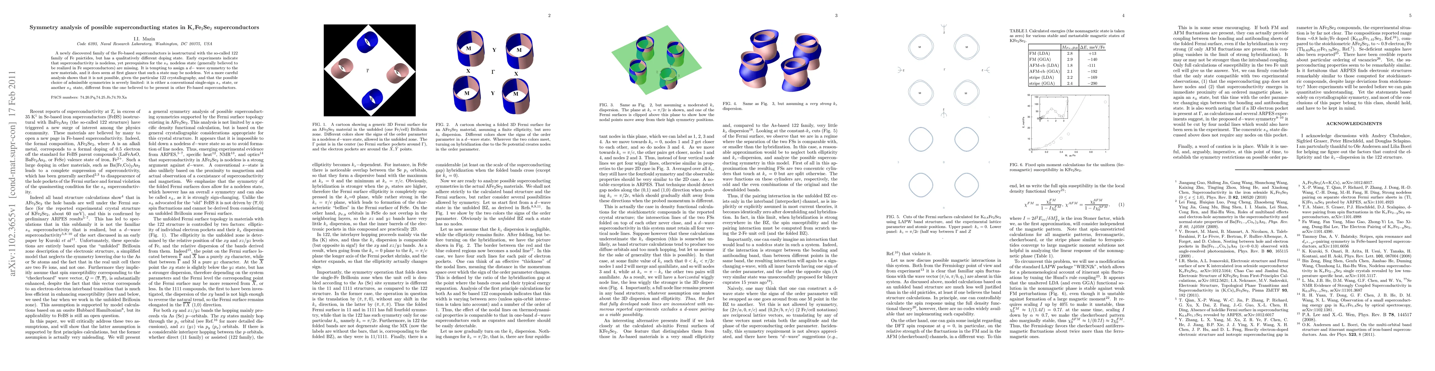 A newly discovered family of the Fe-based superconductors is isostructural with the so-called 122 family of Fe pnictides, but has a qualitatively different doping state. Early experiments indicate that superconductivity is nodeless, yet prerequisites for the $s_\pm$ nodeless state (generally believed to be realized in Fe superconductors) are missing. It is tempting to assign a $d-$ wave symmetry to the new materials, and it does seem at first glance that such a state may be nodeless. Yet a more careful analysis shows that it is not possible, given the particular 122 crystallography, and that the possible choice of admissible symmetries is severly limited: it is either a conventional single-sign $s_{+}$ state, or another $s_\pm$ state, different from the one believed to be present in other Fe-based superconductors.