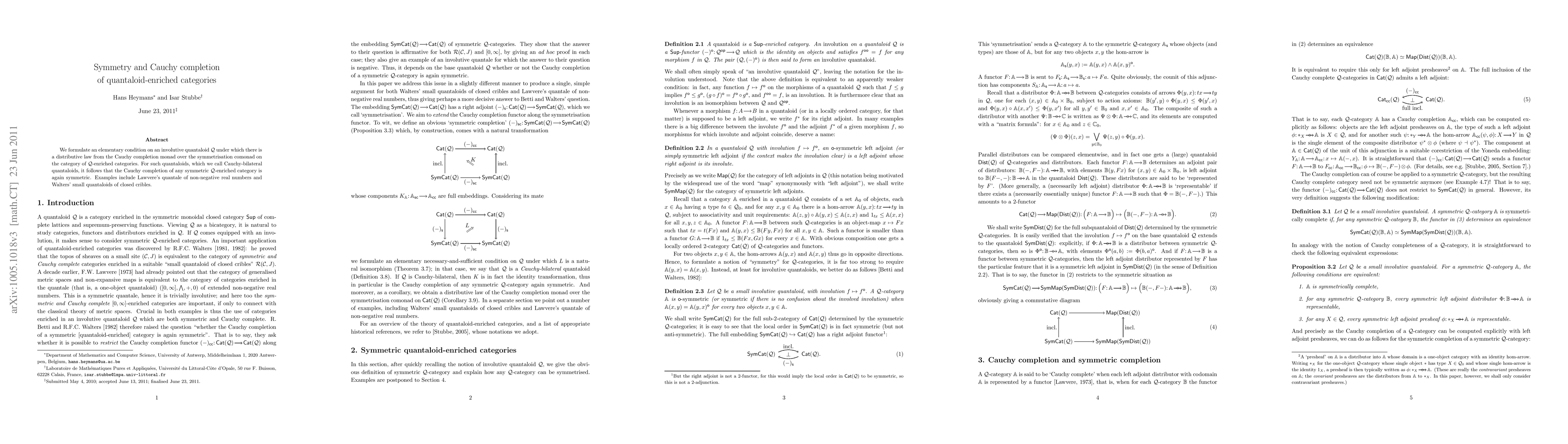 We formulate an elementary condition on an involutive quantaloid Q under which there is a distributive law from the Cauchy completion monad over the symmetrisation comonad on the category of Q-enriched categories. For such quantaloids, which we call Cauchy-bilateral quantaloids, it follows that the Cauchy completion of any symmetric Q-enriched category is again symmetric. Examples include Lawvere's quantale of non-negative real numbers and Walters' small quantaloids of closed cribles.