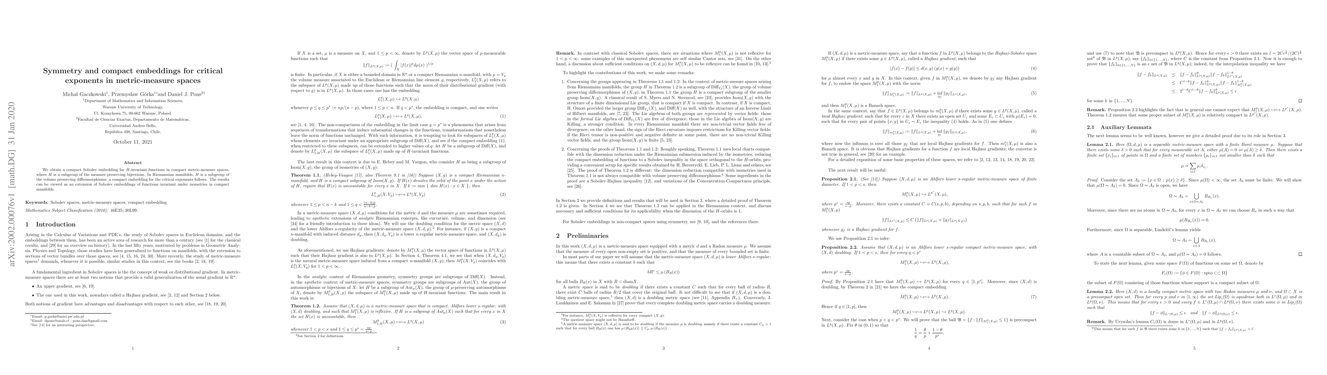 We obtain a compact Sobolev embedding for $H$-invariant functions in compact metric-measure spaces, where $H$ is a subgroup of the measure preserving bijections. In Riemannian manifolds, $H$ is a subgroup of the volume preserving diffeomorphisms: a compact embedding for the critical exponents follows. The results can be viewed as an extension of Sobolev embeddings of functions invariant under isometries in compact manifolds.