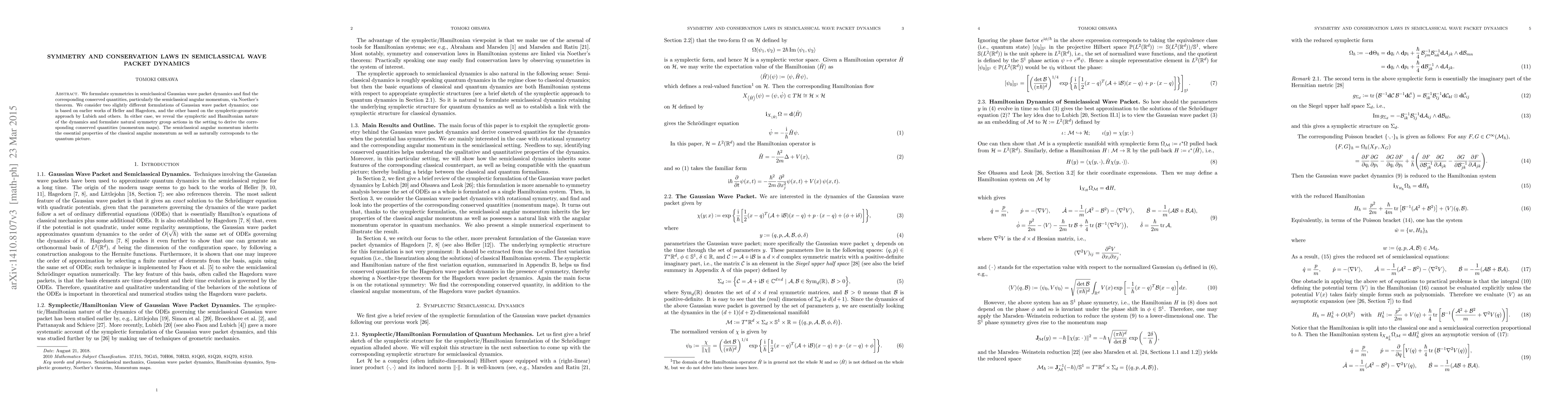 This paper formulates symmetries in semiclassical Gaussian wave packet dynamics and identifies conserved quantities, such as semiclassical angular momentum, using Noether's theorem. It explores the symplectic and Hamiltonian nature of the dynamics, revealing the correspondence between classical and quantum angular momentum.