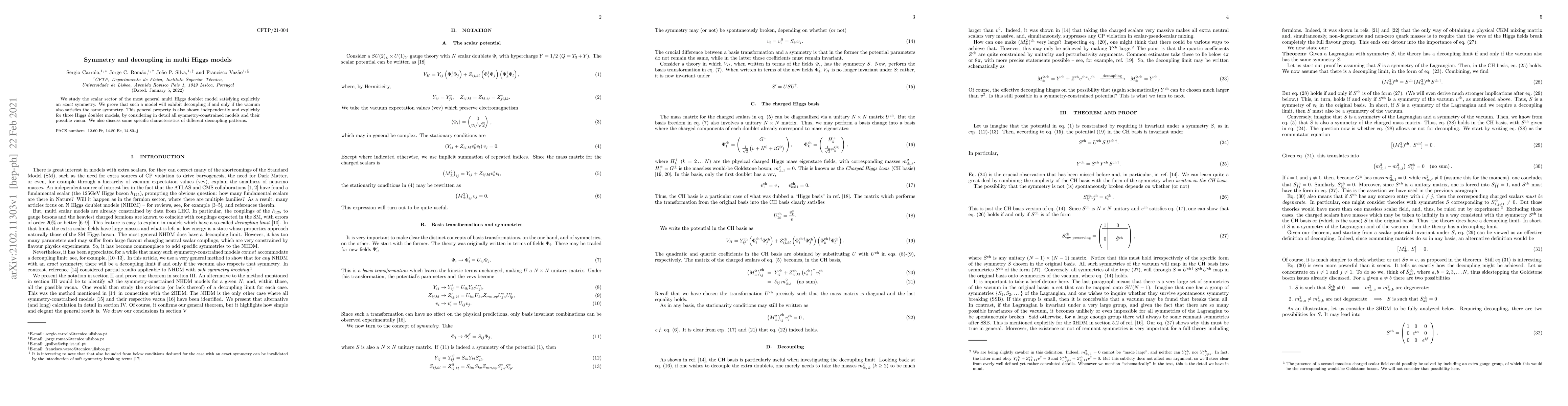 This paper investigates the scalar sector of multi Higgs doublet models with exact symmetry, proving that decoupling occurs if and only if the vacuum respects the same symmetry. It also examines three Higgs doublet models in detail to illustrate these properties and discusses various decoupling patterns.
