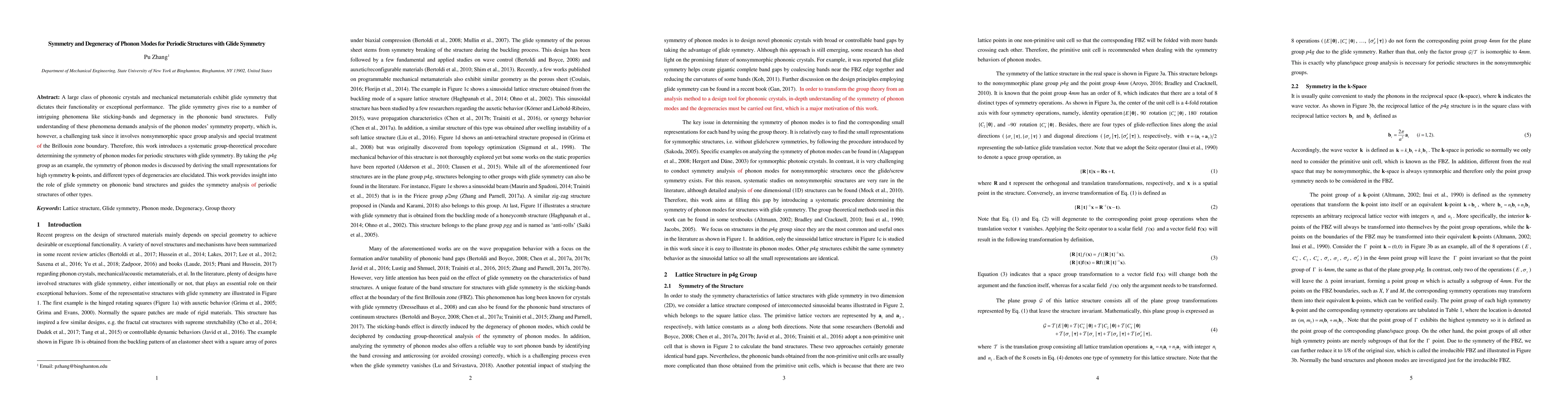 This paper develops a systematic group-theoretical method to determine the symmetry properties of phonon modes in periodic structures with glide symmetry, using the p4g group as an example. It elucidates various types of degeneracies and provides insights into the influence of glide symmetry on phononic band structures.