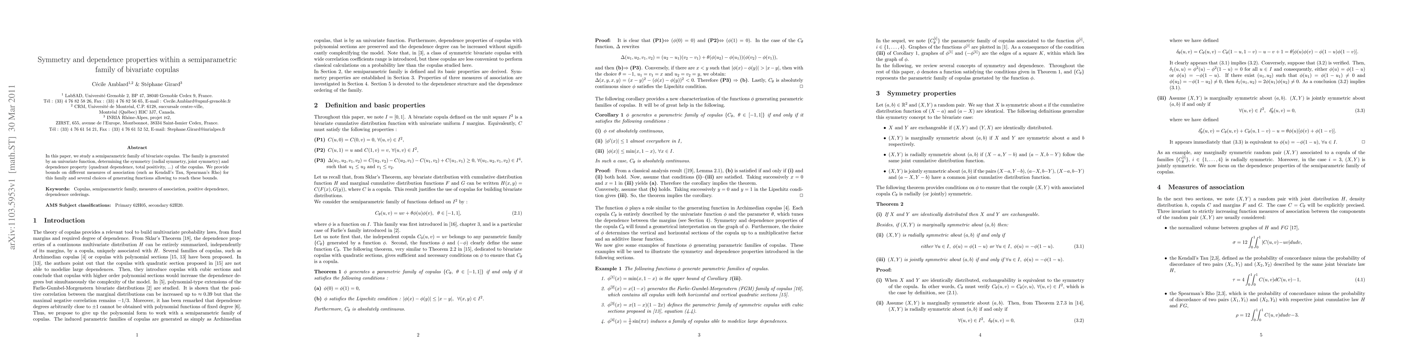 This paper investigates a semiparametric family of bivariate copulas defined by a univariate function that controls symmetry and dependence properties. It provides bounds on association measures like Kendall's Tau and Spearman's Rho for various generating functions within this family.