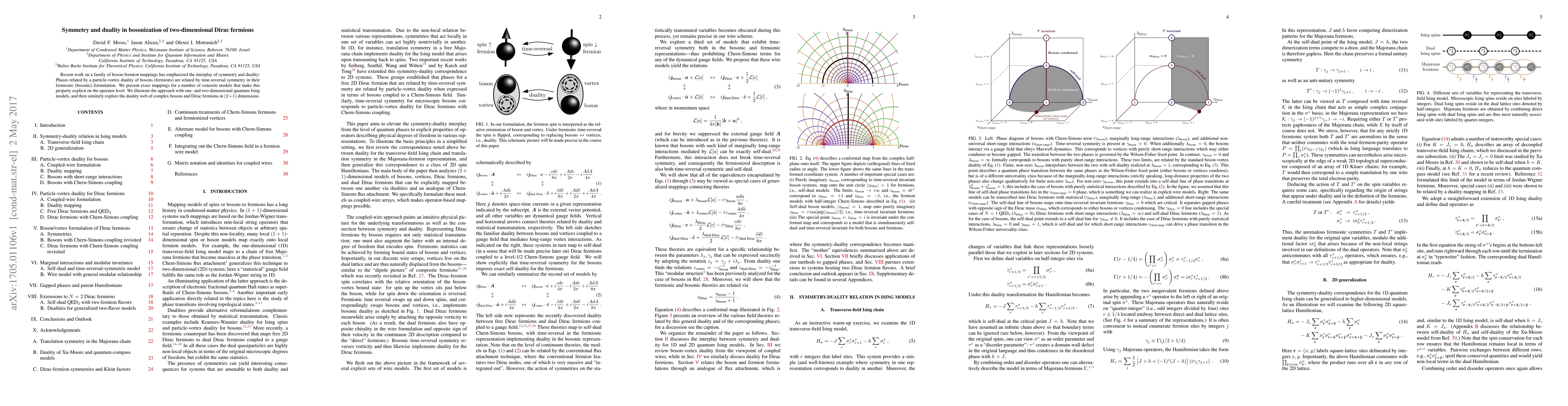 This paper explores the interplay of symmetry and duality in bosonization of two-dimensional Dirac fermions, presenting exact mappings that explicitly link phases related by particle-vortex duality through time-reversal symmetry. It applies these mappings to quantum Ising models and examines the duality in (2+1) dimensions involving complex bosons and Dirac fermions.