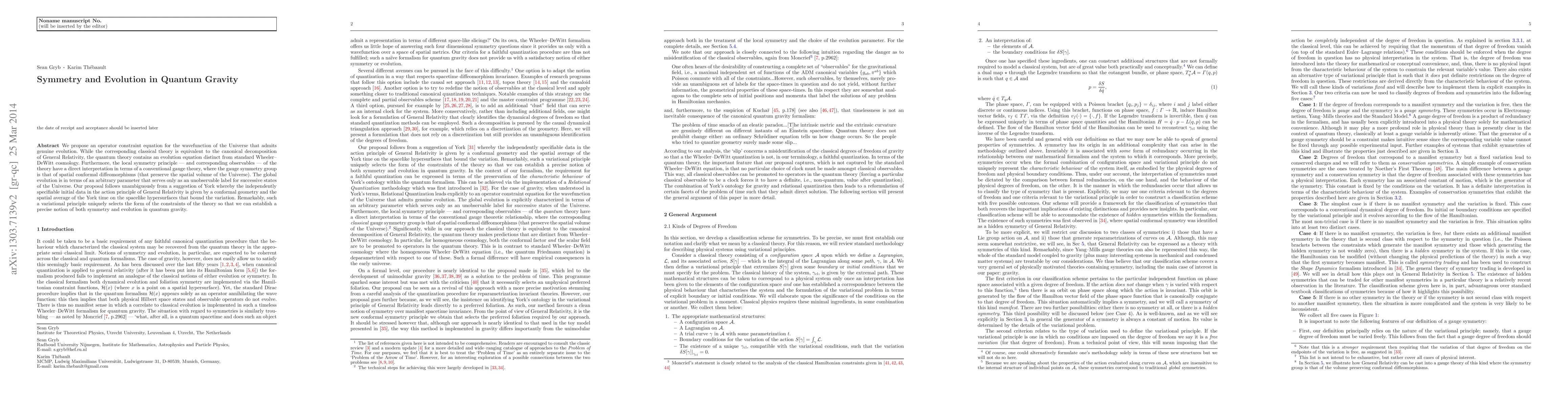 We propose an operator constraint equation for the wavefunction of the Universe that admits genuine evolution. While the corresponding classical theory is equivalent to the canonical decomposition of General Relativity, the quantum theory makes predictions that are distinct from Wheeler-DeWitt cosmology. Furthermore, the local symmetry principle - and corresponding observables - of the theory have a direct interpretation in terms of a conventional gauge theory, where the gauge symmetry group is that of spatial conformal diffeomorphisms (that preserve the spatial volume of the Universe). The global evolution is in terms of an arbitrary parameter that serves only as an unobservable label for successive states of the Universe. Our proposal follows unambiguously from a suggestion of York whereby the independently specifiable initial data in the action principle of General Relativity is given by a conformal geometry and the spatial average of the York time on the spacelike hypersurfaces that bound the variation. Remarkably, such a variational principle uniquely selects the form of the constraints of the theory so that we can establish a precise notion of both symmetry and evolution in quantum gravity.