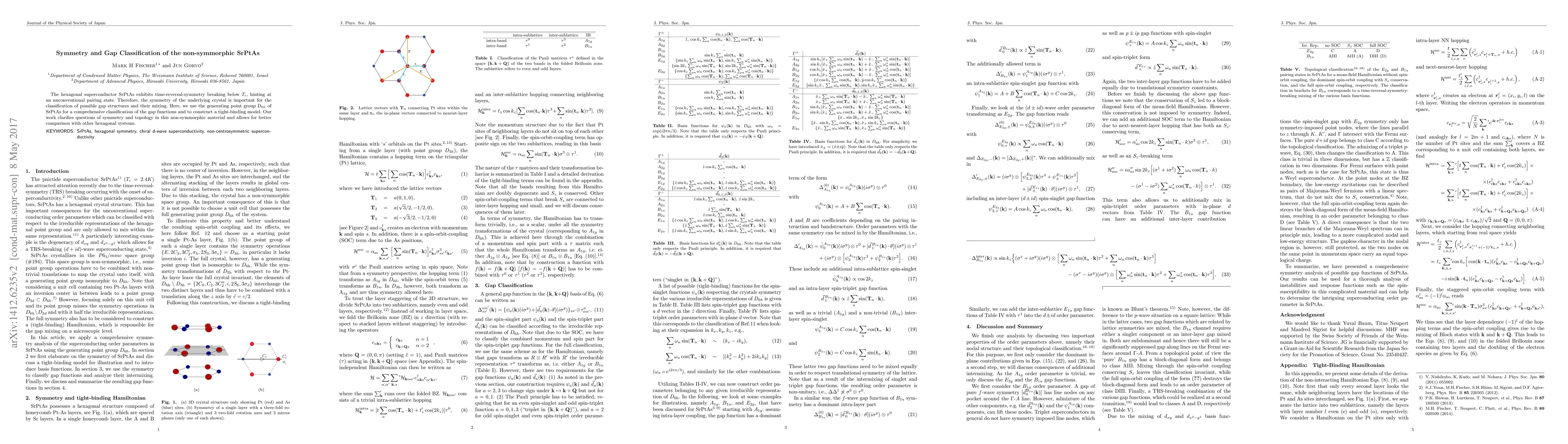 The hexagonal superconductor SrPtAs exhibits time-reversal-symmetry breaking below $T_c$, hinting at an unconventional pairing state. Therefore, the symmetry of the underlying crystal is important for the classification of possible gap structures and their mixing. Here, we use the generating point group D$_{6h}$ of SrPtAs for a comprehensive classification of the gap functions and to construct a tight-binding model. Our work clarifies questions of symmetry and topology in this non-symmorphic material and allows for better comparison with other hexagonal systems.