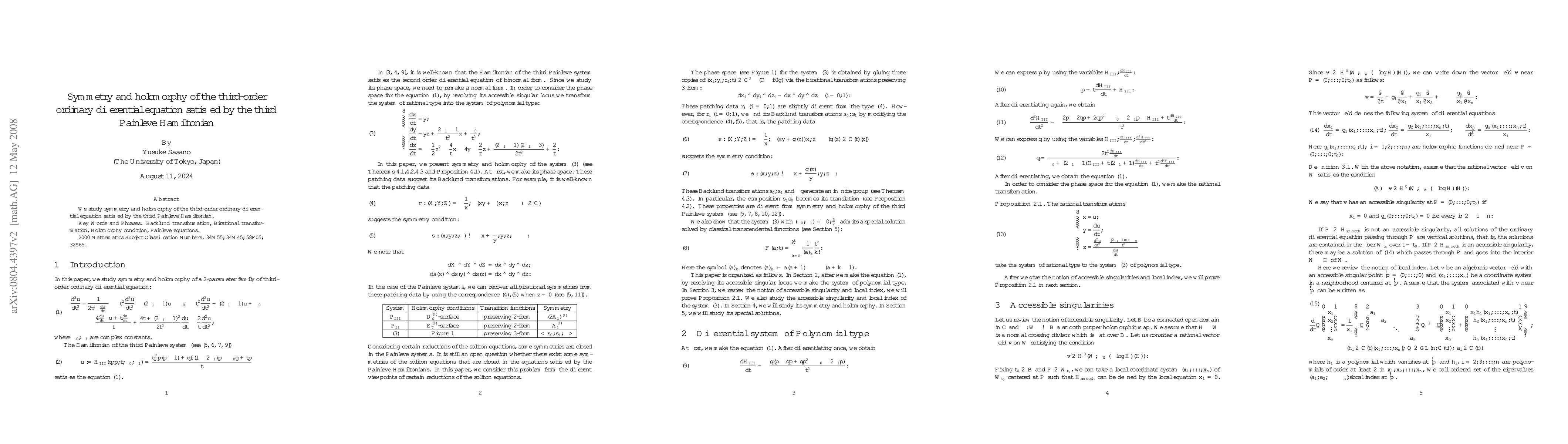 We study symmetry and holomorphy of the third-order ordinary differential equation satisfied by the third Painlev\'e Hamiltonian.