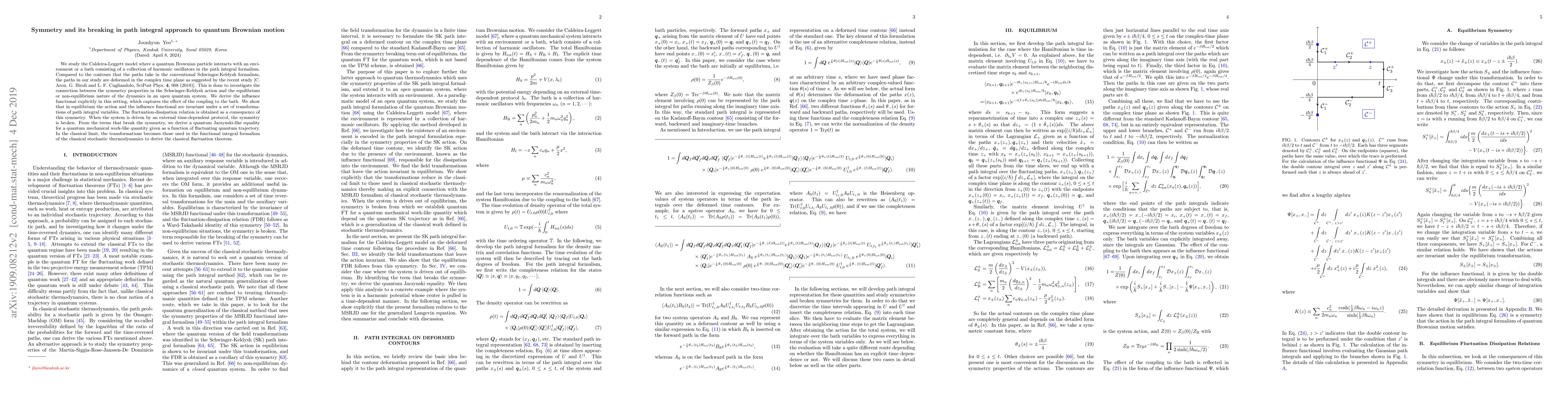 We study the Caldeira-Leggett model where a quantum Brownian particle interacts with an environment or a bath consisting of a collection of harmonic oscillators in the path integral formalism. Compared to the contours that the paths take in the conventional Schwinger-Keldysh formalism, the paths in our study are deformed in the complex time plane as suggested by the recent study [C. Aron, G. Biroli and L. F. Cugliandolo, SciPost Phys.\ {\bf 4}, 008 (2018)]. This is done to investigate the connection between the symmetry properties in the Schwinger-Keldysh action and the equilibrium or non-equilibrium nature of the dynamics in an open quantum system. We derive the influence functional explicitly in this setting, which captures the effect of the coupling to the bath. We show that in equilibrium the action and the influence functional are invariant under a set of transformations of path integral variables. The fluctuation-dissipation relation is obtained as a consequence of this symmetry. When the system is driven by an external time-dependent protocol, the symmetry is broken. From the terms that break the symmetry, we derive a quantum Jarzynski-like equality for quantum mechanical work given as a function of fluctuating quantum trajectory. In the classical limit, the transformations becomes those used in the functional integral formalism of the classical stochastic thermodynamics to derive the classical fluctuation theorem.