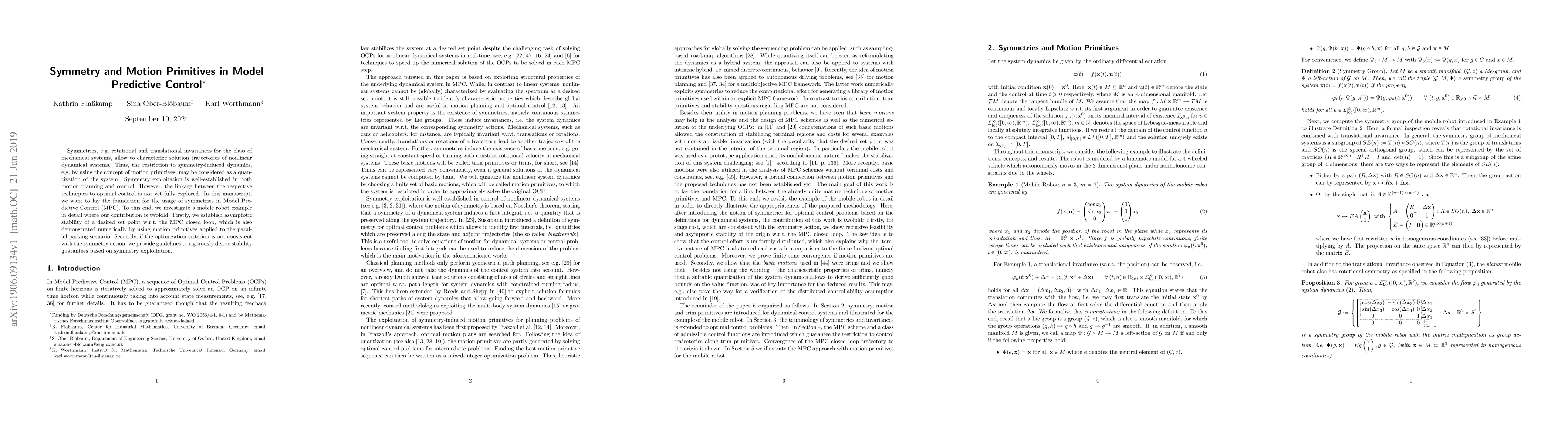 This paper explores the use of symmetries in Model Predictive Control (MPC) to enhance stability and efficiency. It establishes asymptotic stability for a desired set point in the MPC framework using motion primitives, demonstrated through a mobile robot parallel parking scenario. It also provides guidelines for stability guarantees when the optimization criterion does not align with symmetry actions.