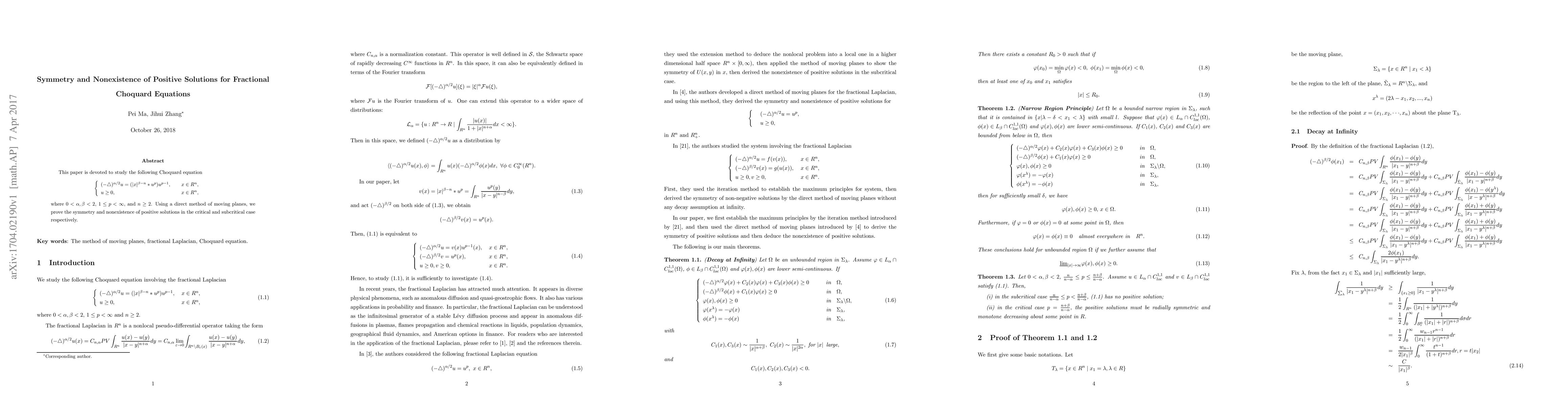 This paper investigates the symmetry and nonexistence of positive solutions for fractional Choquard equations using a direct method of moving planes. It demonstrates symmetry in solutions and proves nonexistence in both critical and subcritical cases.